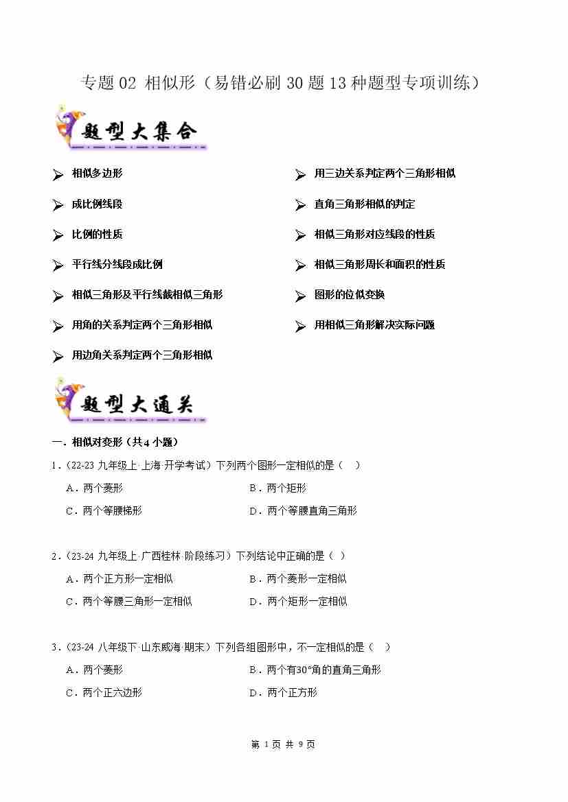 专题02 相似形(考题猜想,易错必刷30题13种题型)(原卷版)
