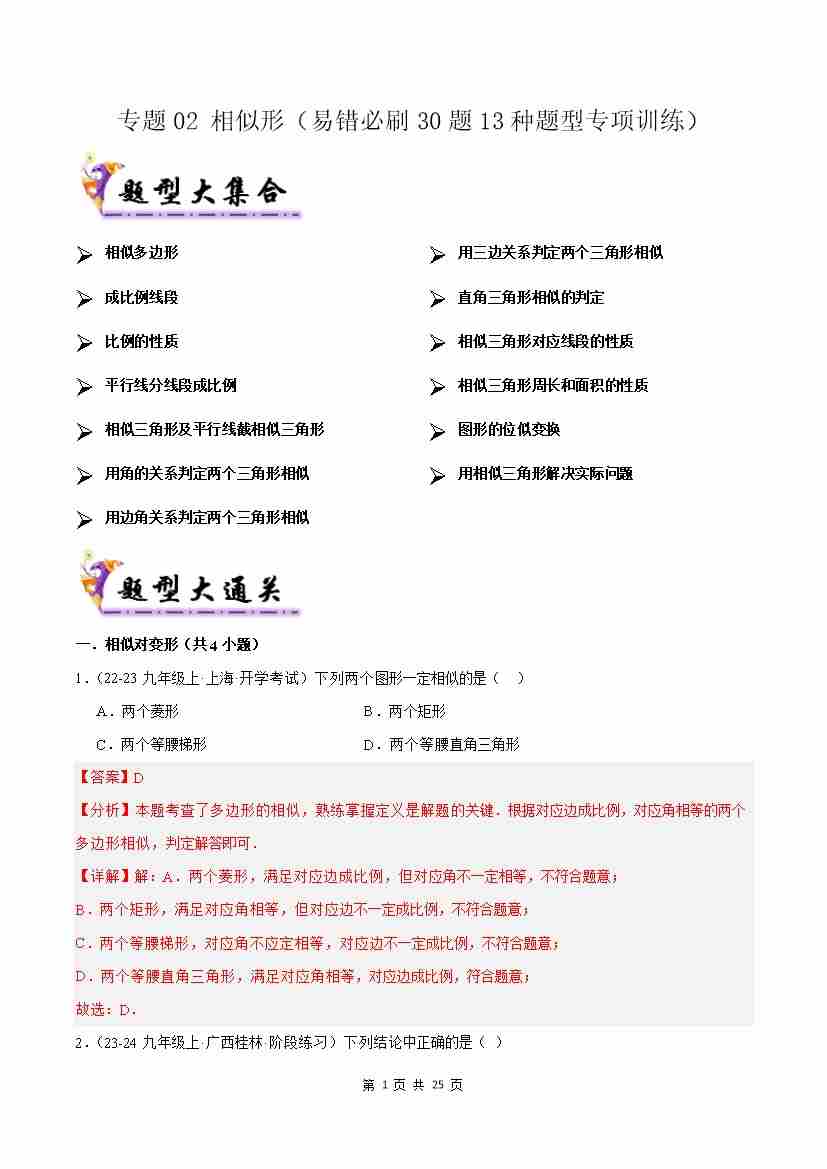 专题02 相似形(考题猜想,易错必刷30题13种题型)(解析版)