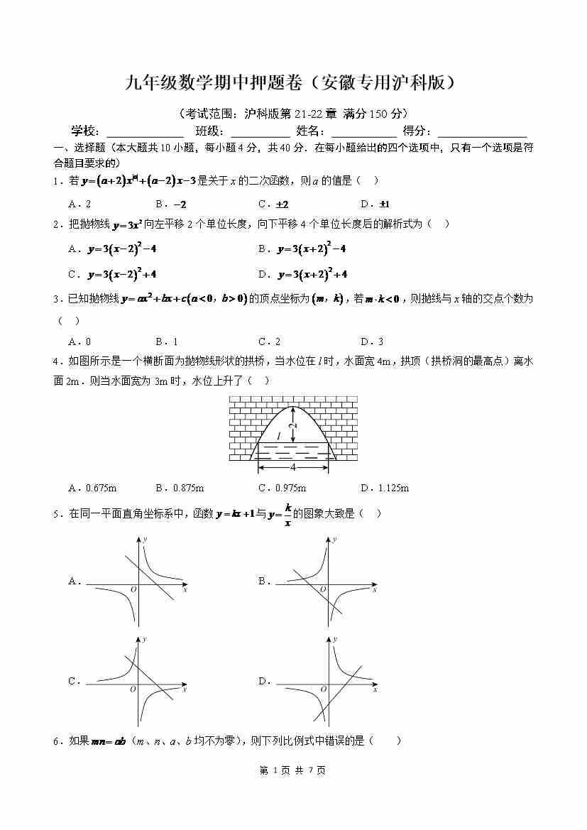 【沪科】9上数学期中卷【第21-22.3章】