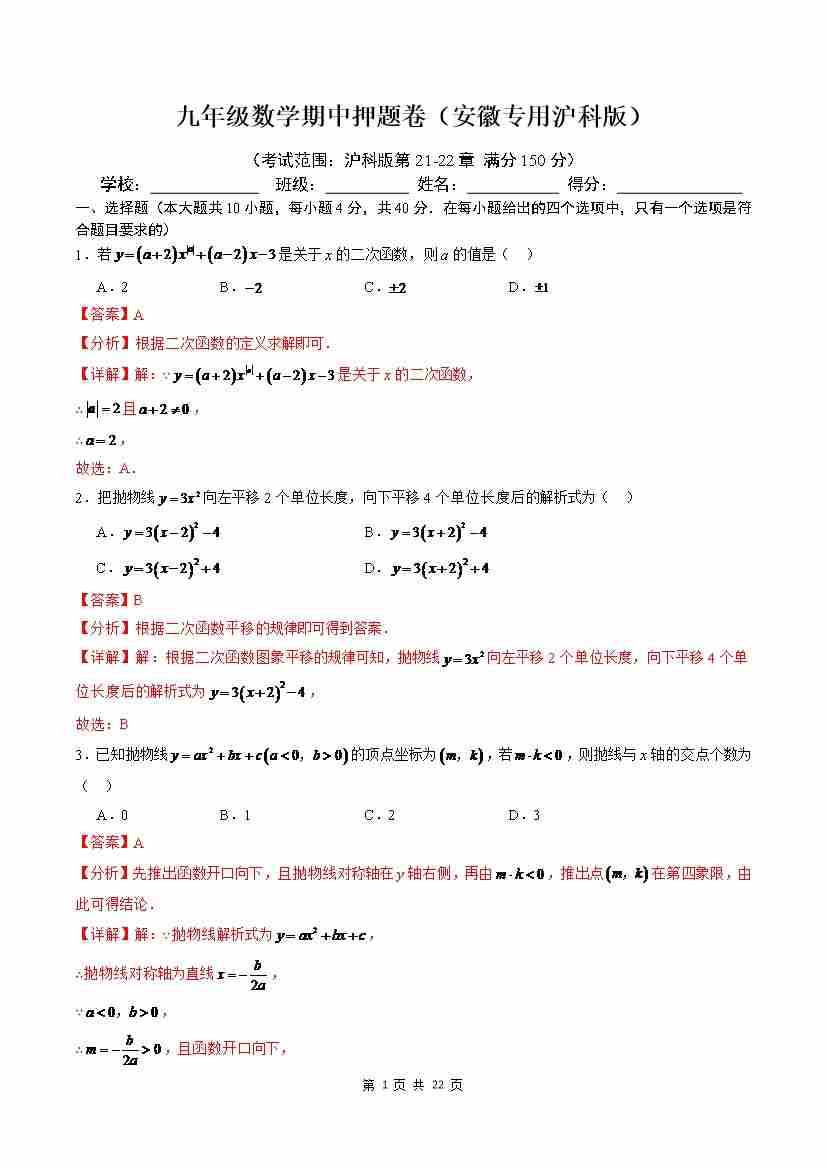 九年级期中押题卷【安徽专用,沪科版】(考试范围:第21-22章)(解析版)