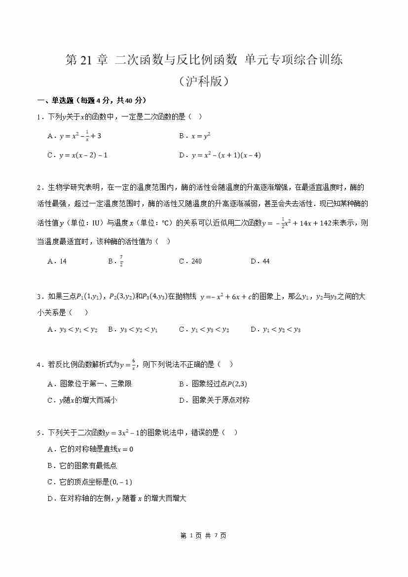 第21章 二次函数与反比例函数 单元专项综合训练(原卷版)