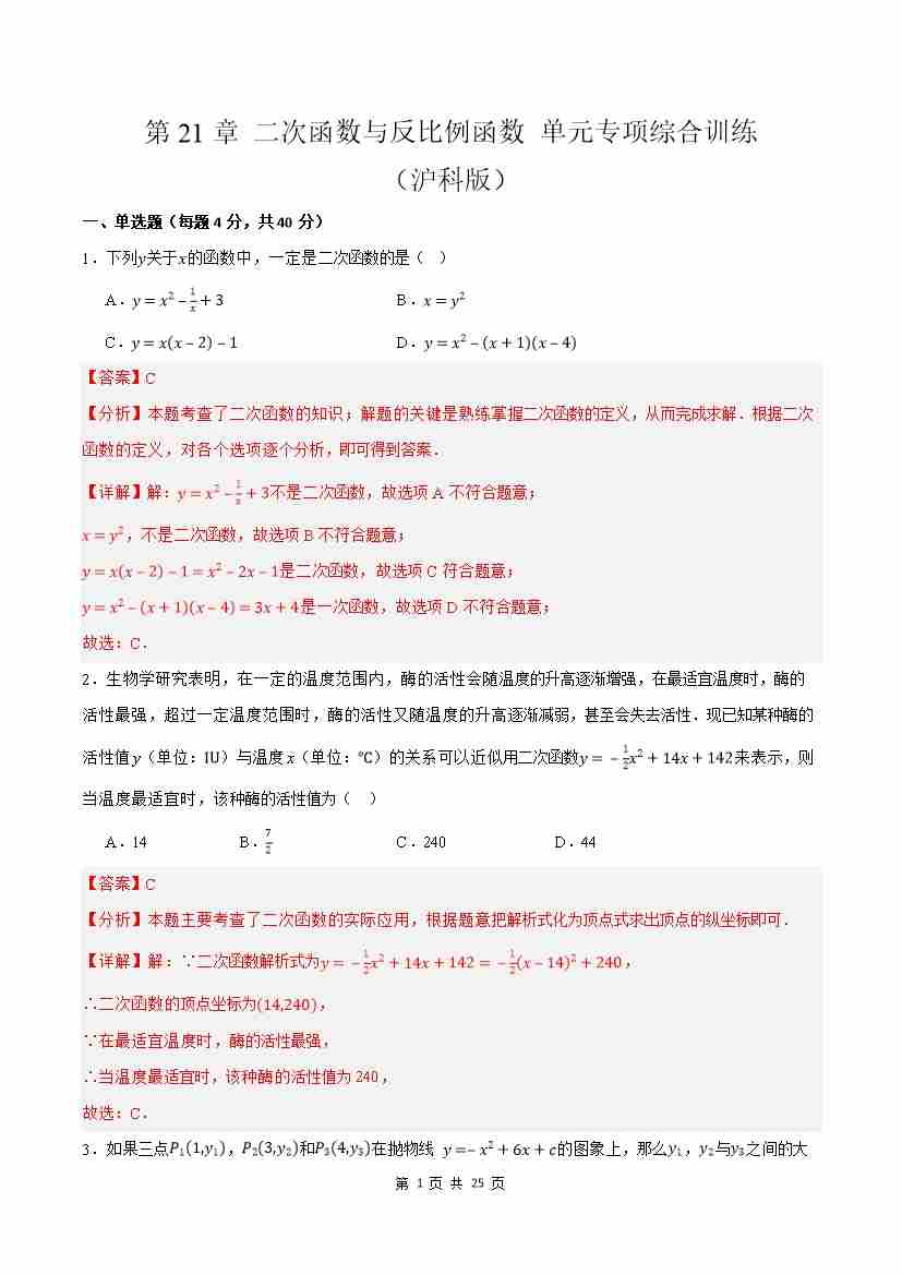 第21章 二次函数与反比例函数 单元专项综合训练(解析版)