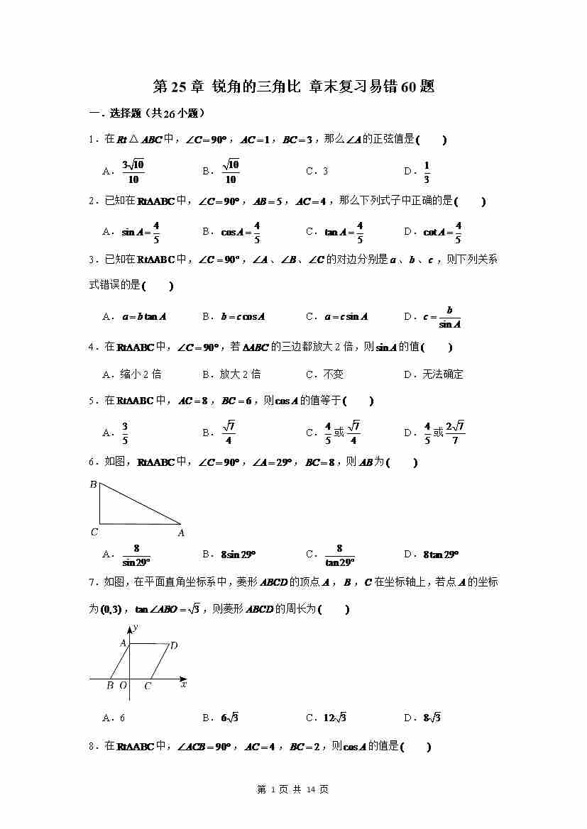 第25章 锐角的三角比 章末复习易错60题(原卷版)