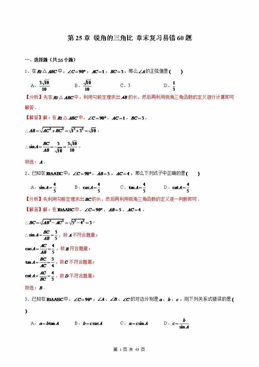 第25章 锐角的三角比 章末复习易错60题(解析版)