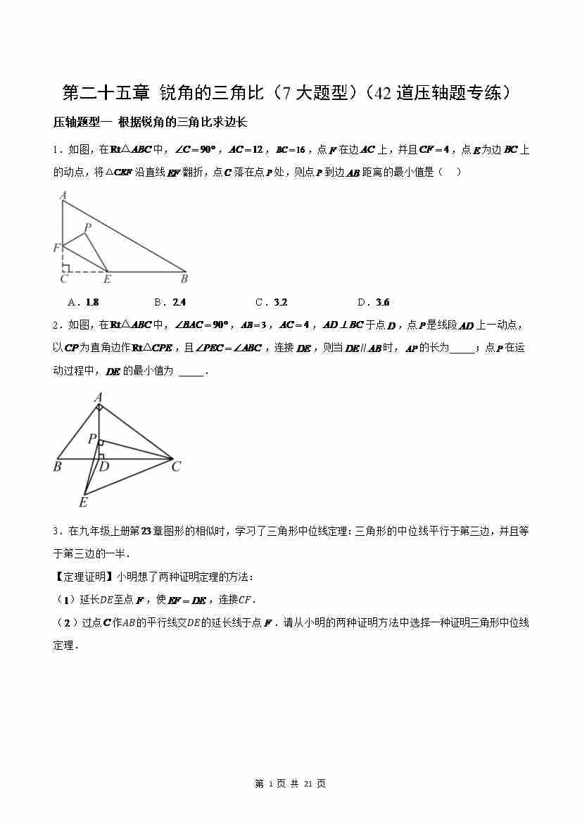 第25章 锐角的三角比(7大题型)(42道压轴题专练)(原卷版)