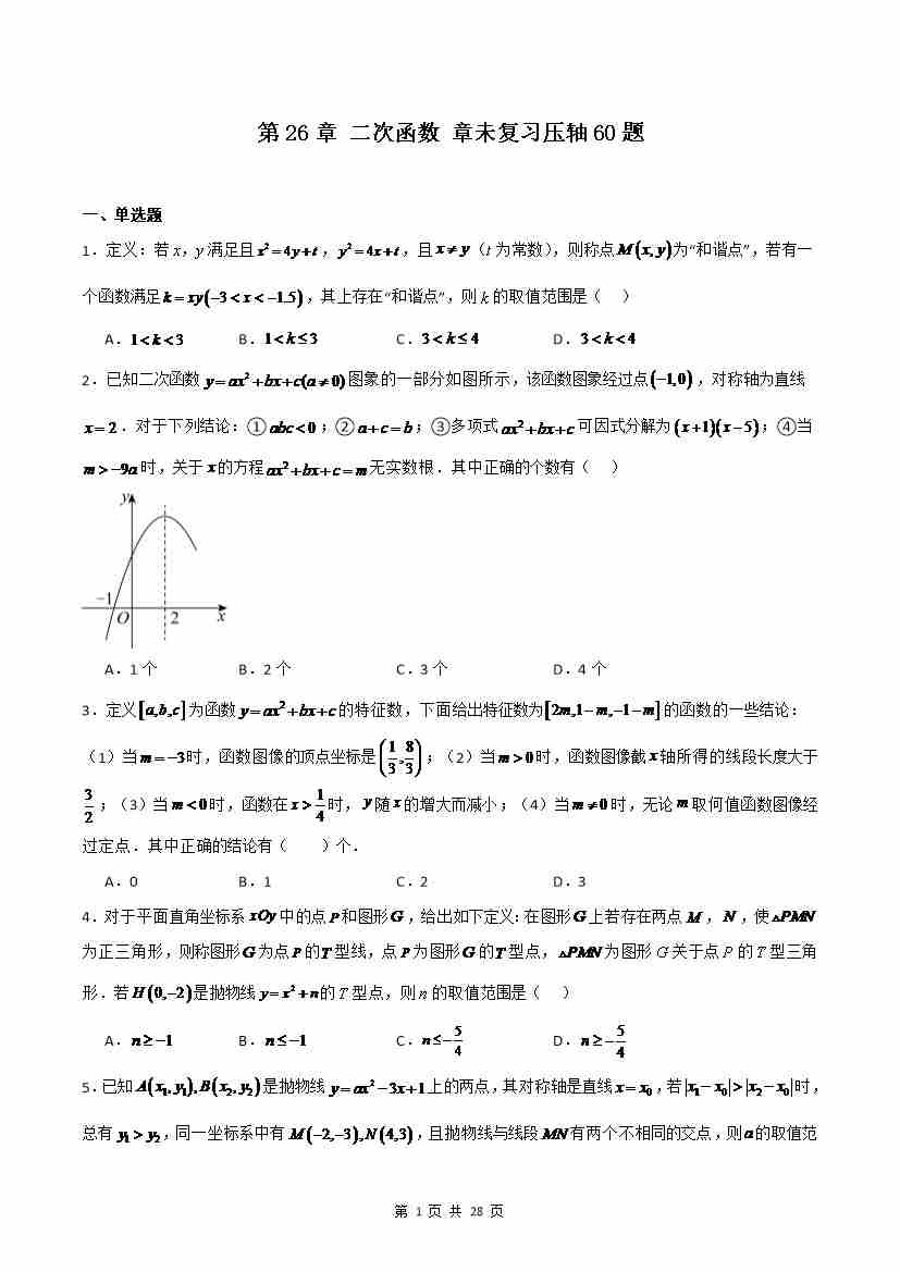 第26章 二次函数 章末复习压轴60题(原卷版)