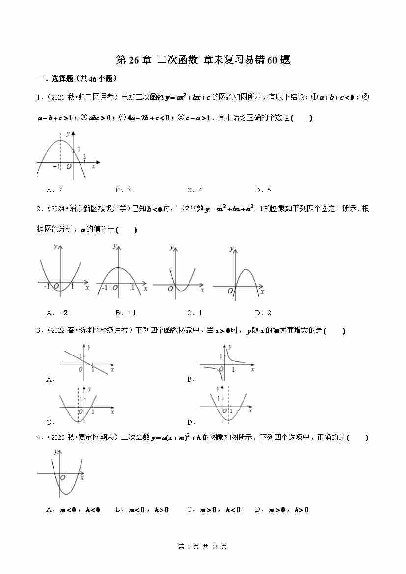 第26章 二次函数 章末复习易错60题(原卷版)