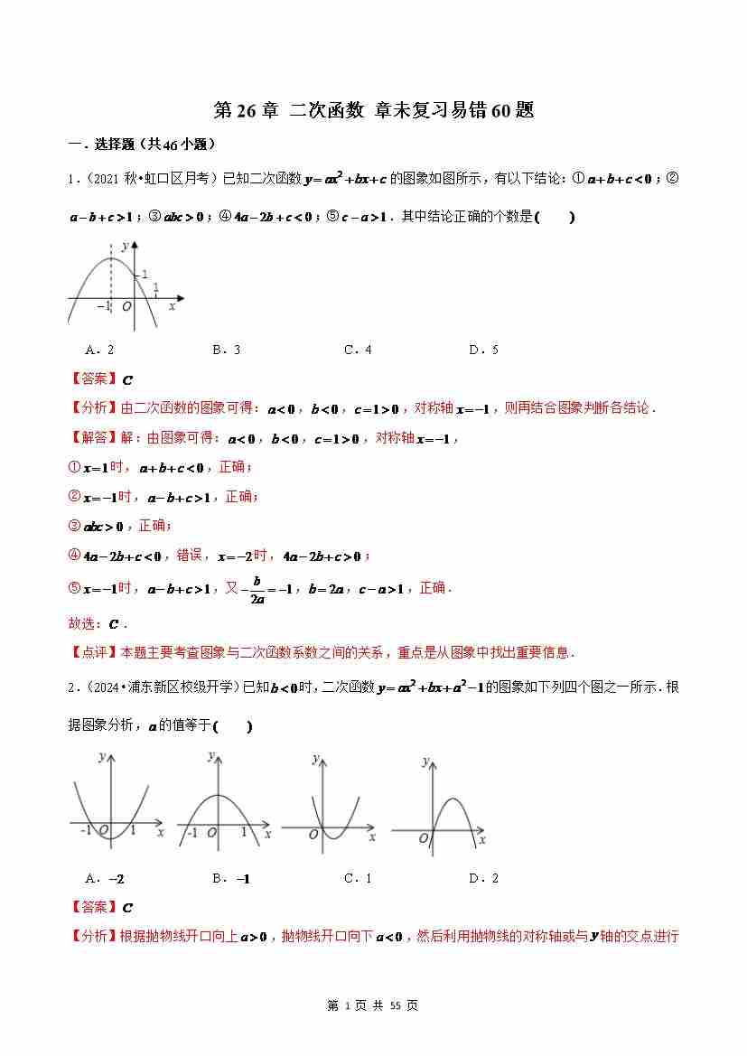 第26章 二次函数 章末复习易错60题(解析版)