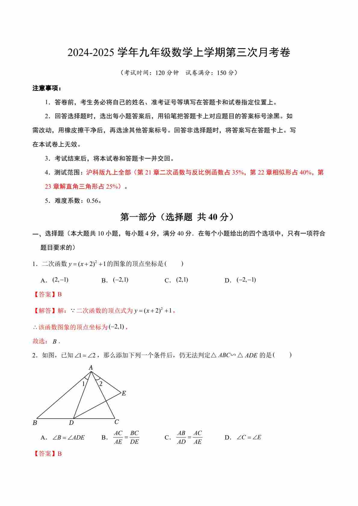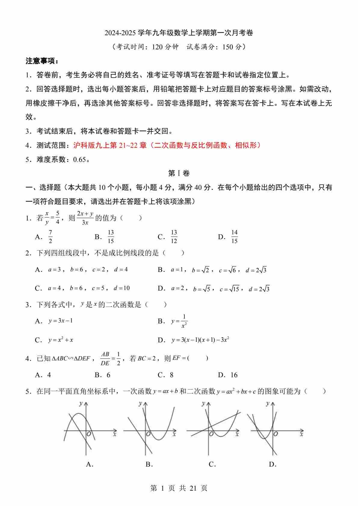 【沪科】9上数学第1次月考【第21-22章】(1)