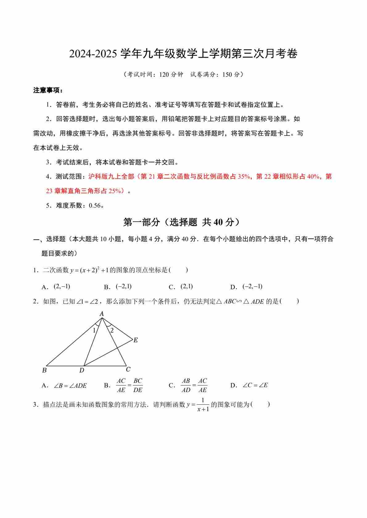 九上数学:【沪科】第三次月考卷