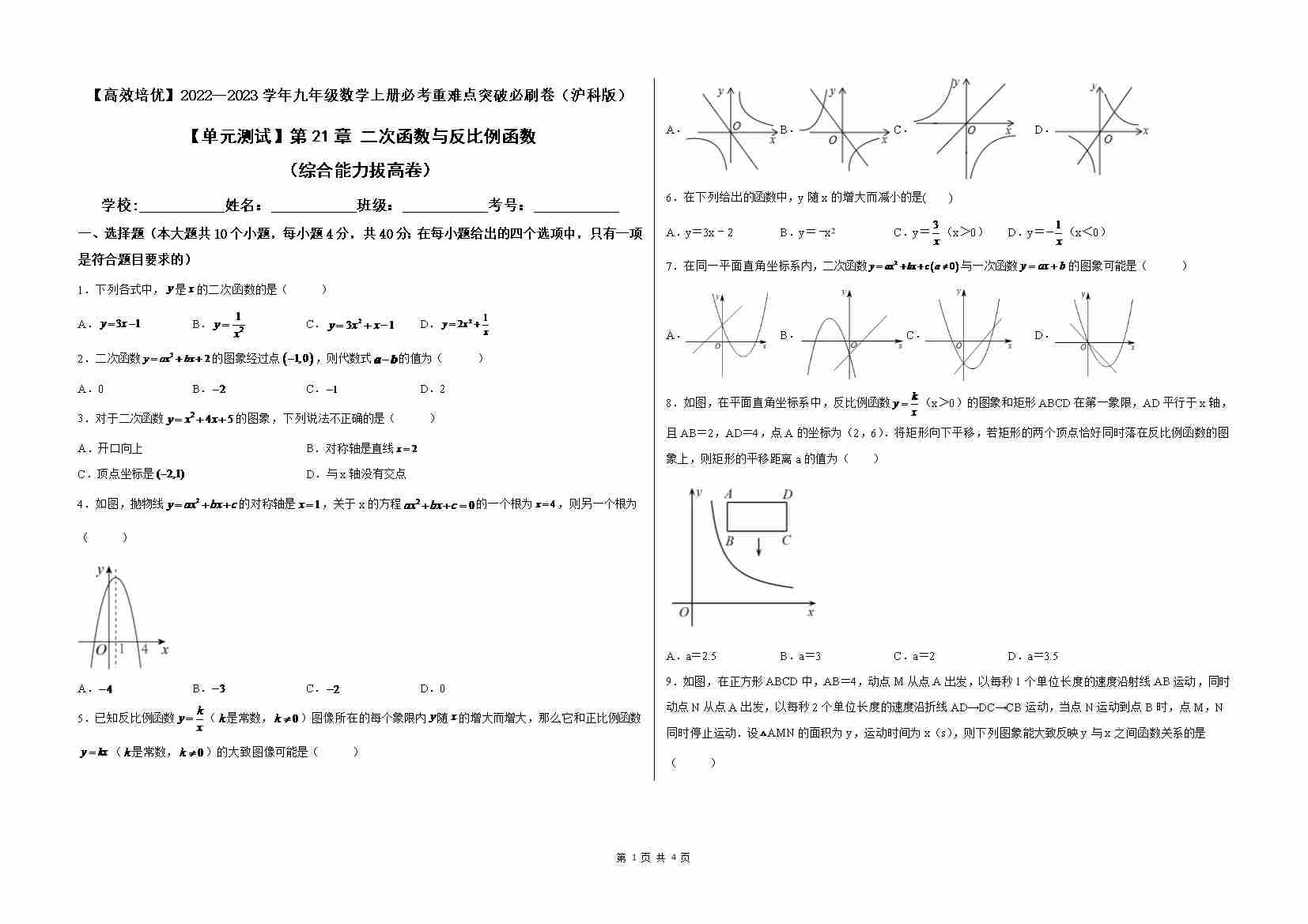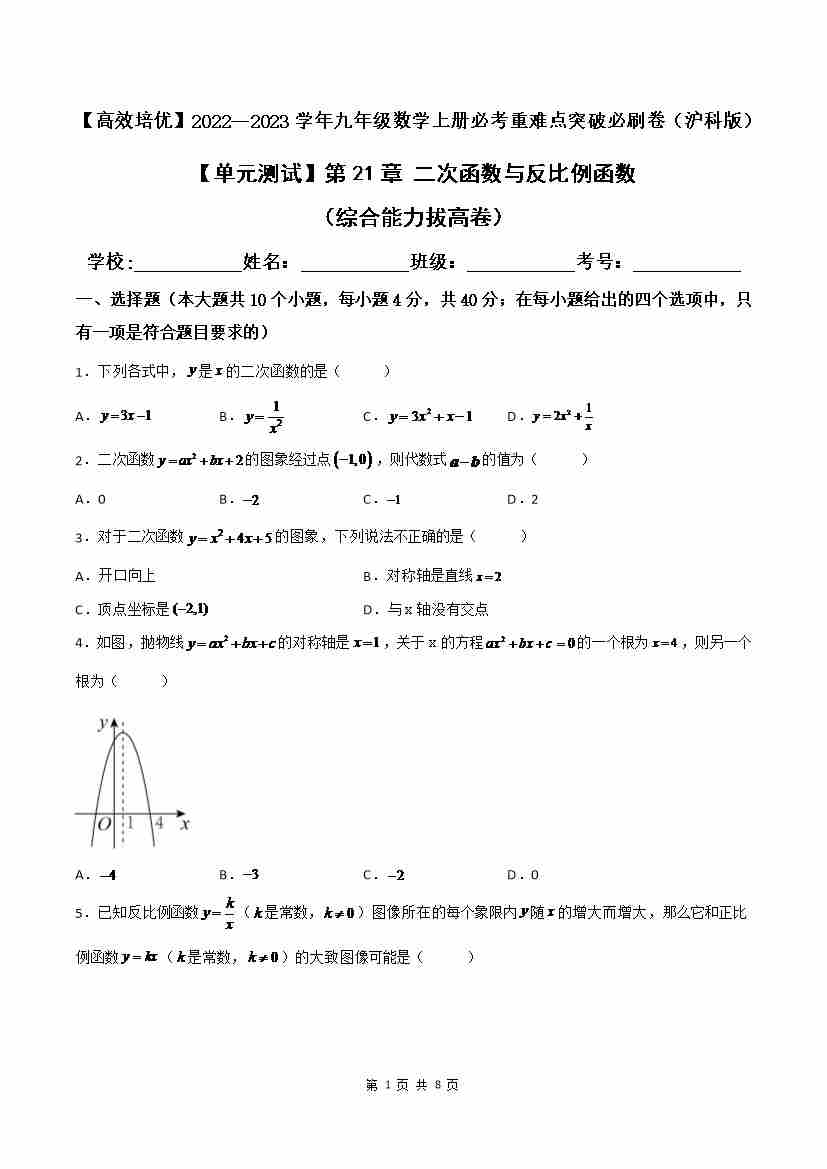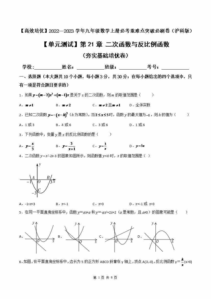 第21章 二次函数与反比例函数(综合能力拔高卷)(原卷版)