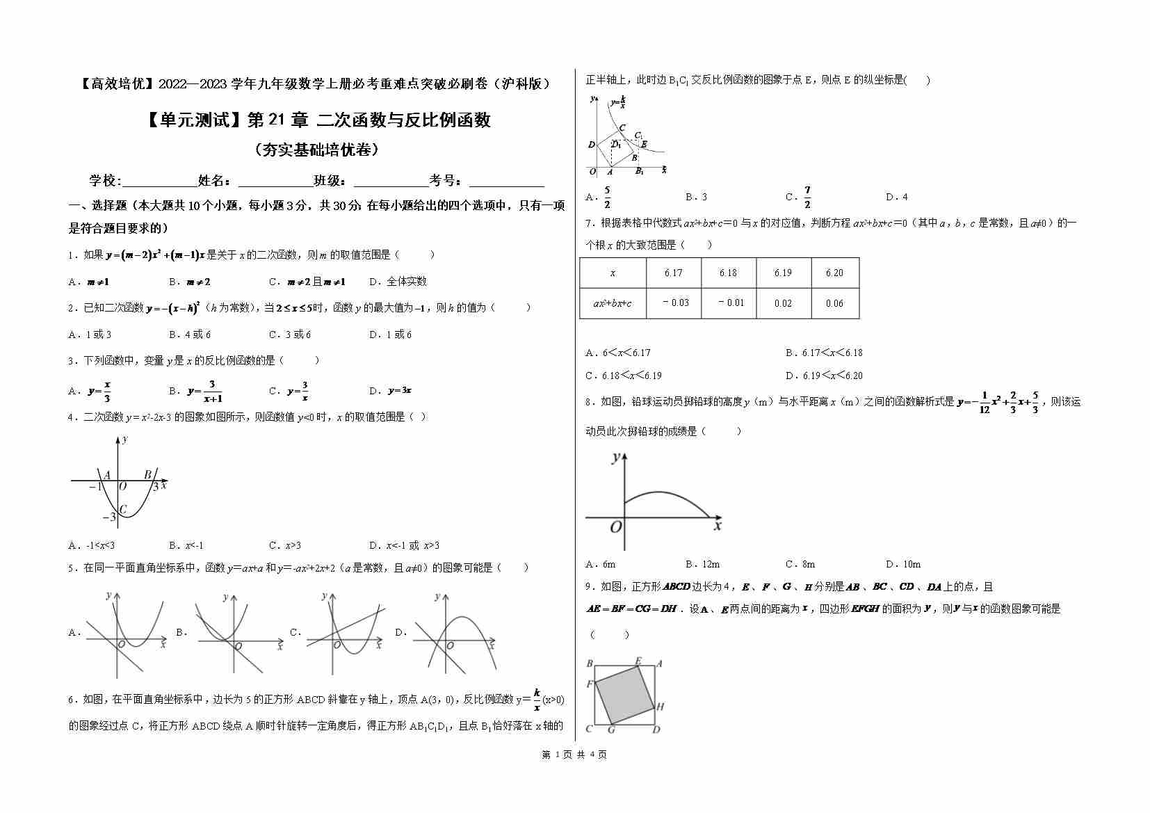 第21章 二次函数与反比例函数(夯实基础培优卷)(考试版)