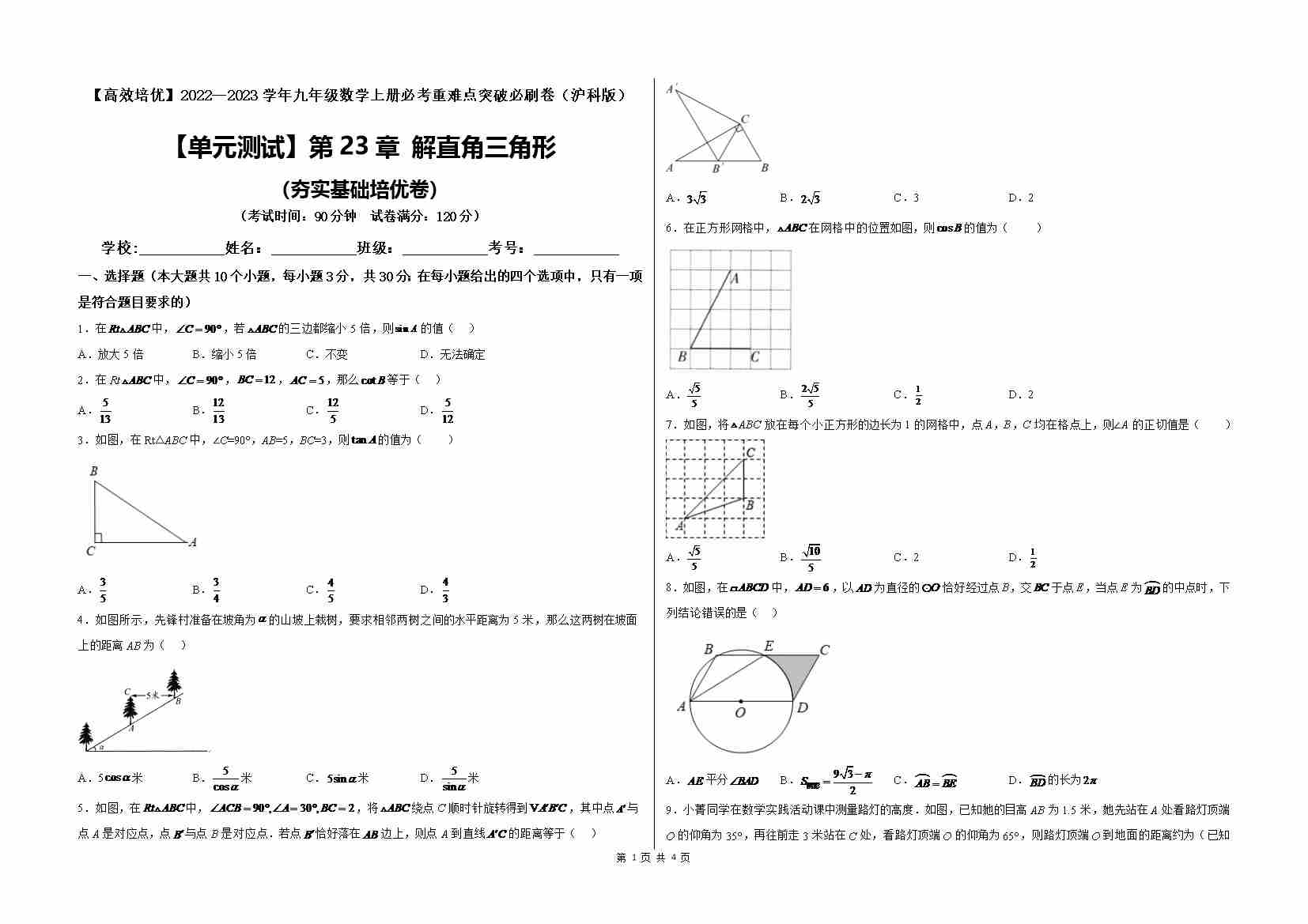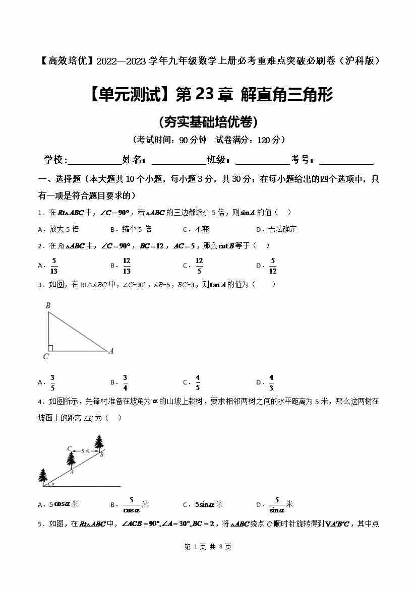 第23章 解直角三角形(夯实基础培优卷)(原卷版)