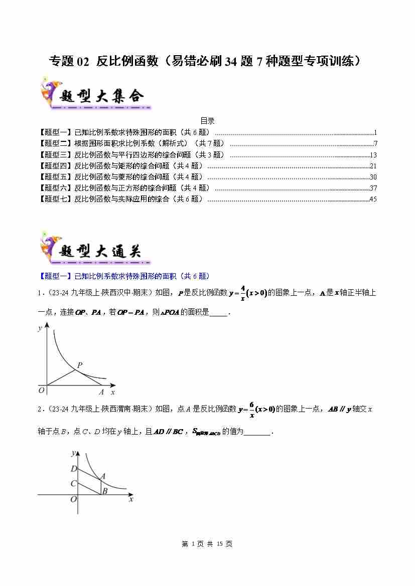 专题02 反比例函数(考题猜想,易错必刷34题7种题型)(原卷版)