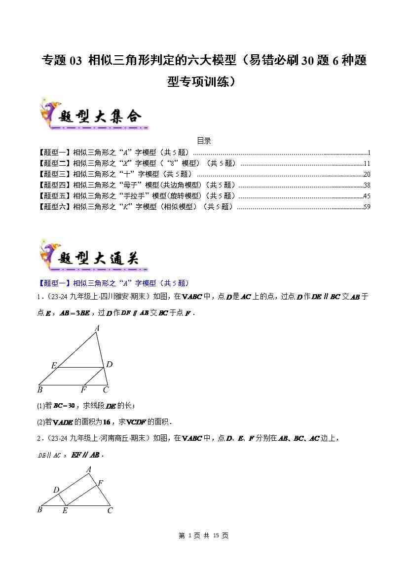专题03 相似三角形判定的六大模型(考题猜想,易错必刷30题6种题型)(原卷版)