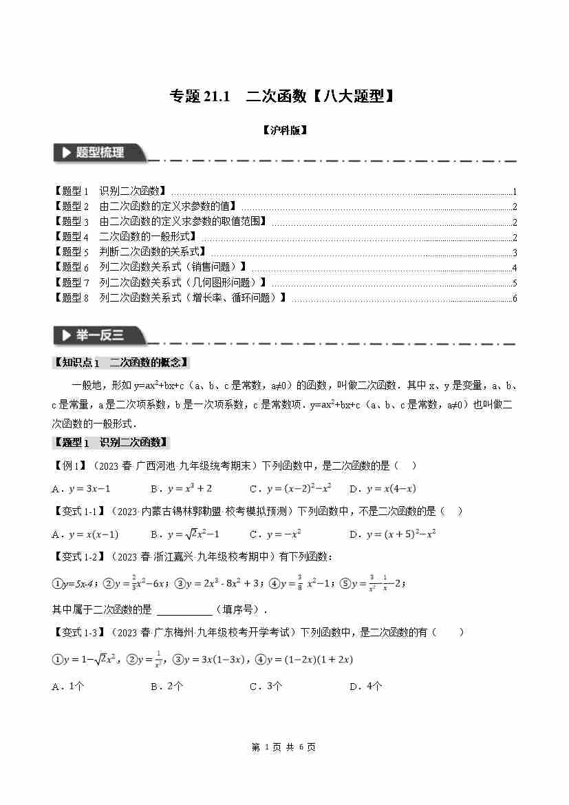 专题21.1 二次函数【八大题型】(举一反三)(沪科版)(原卷版)