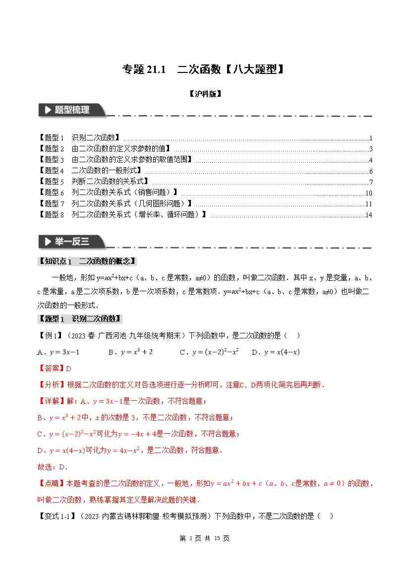 专题21.1 二次函数【八大题型】(举一反三)(沪科版)(解析版)