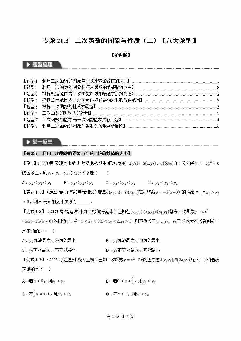 专题21.3 二次函数的图象与性质(二)【八大题型】(举一反三)(人教版)(原卷版)