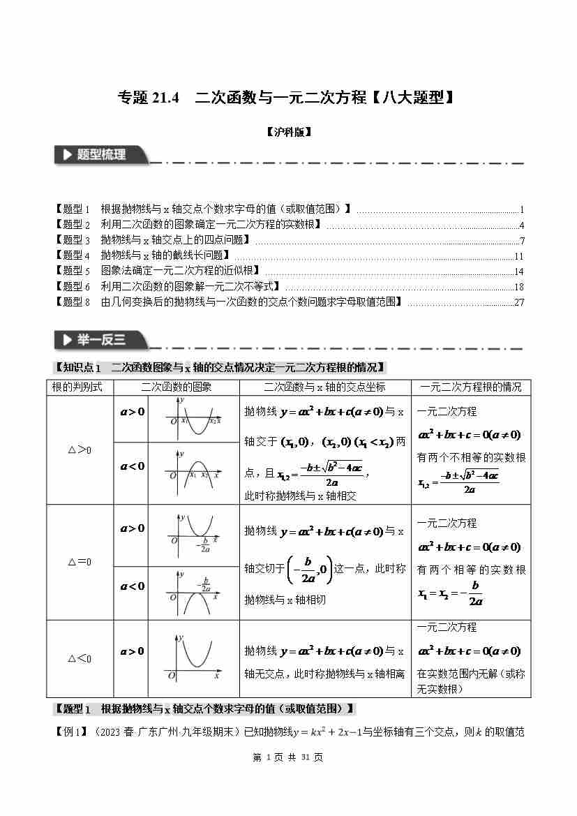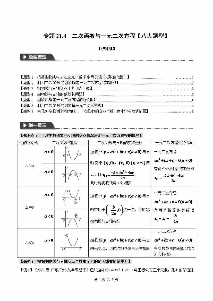 专题21.4 二次函数与一元二次方程【八大题型】(举一反三)(沪科版)(原卷版)