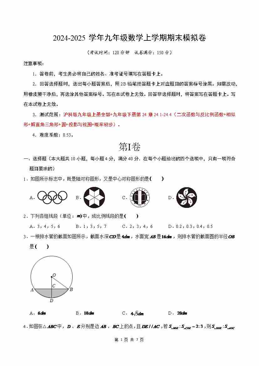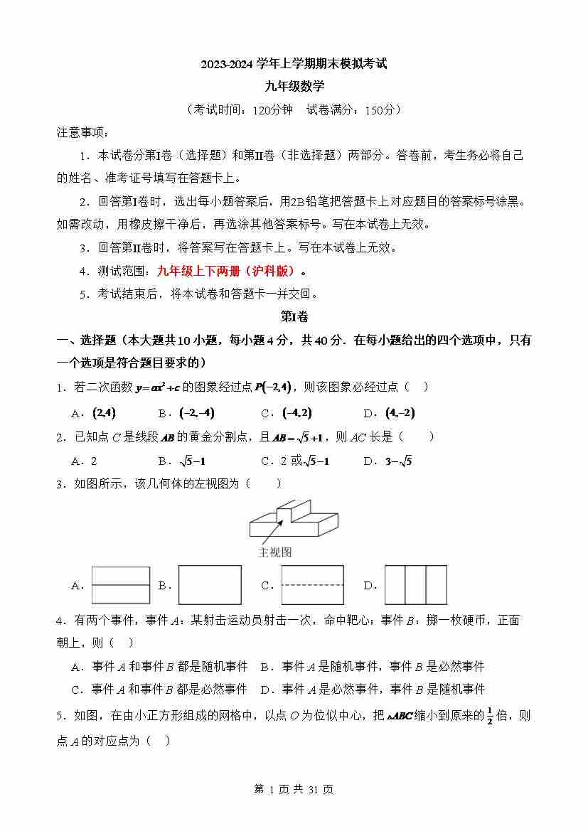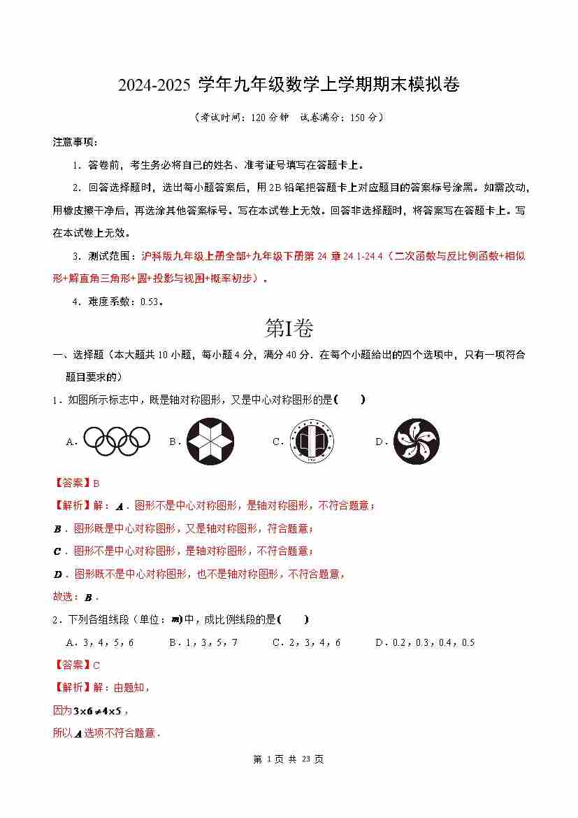 【沪科】9上数学期末卷【9上全部+9下24.1~24.4】