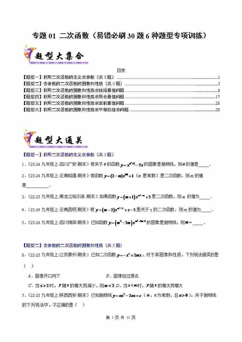 专题01 二次函数(考题猜想,易错必刷30题6种题型)(原卷版)