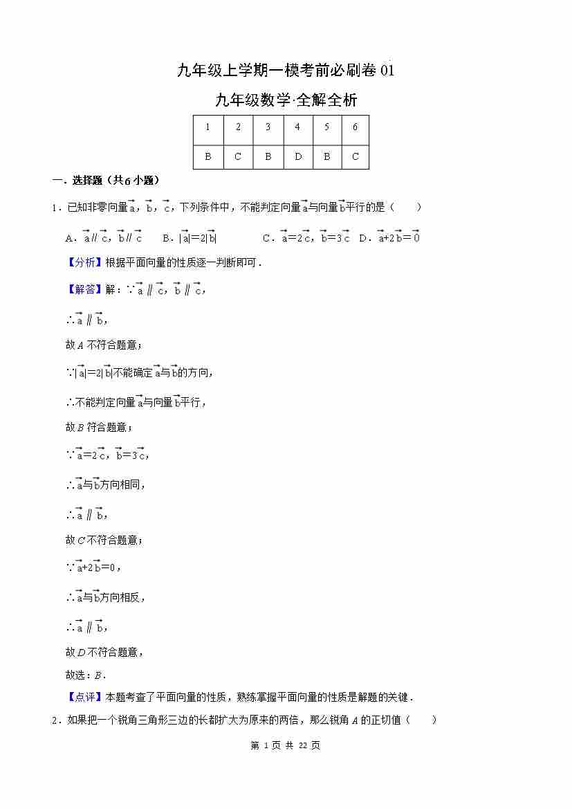基础卷:九年级数学一模考前必刷卷01(沪教版)(全解全析)