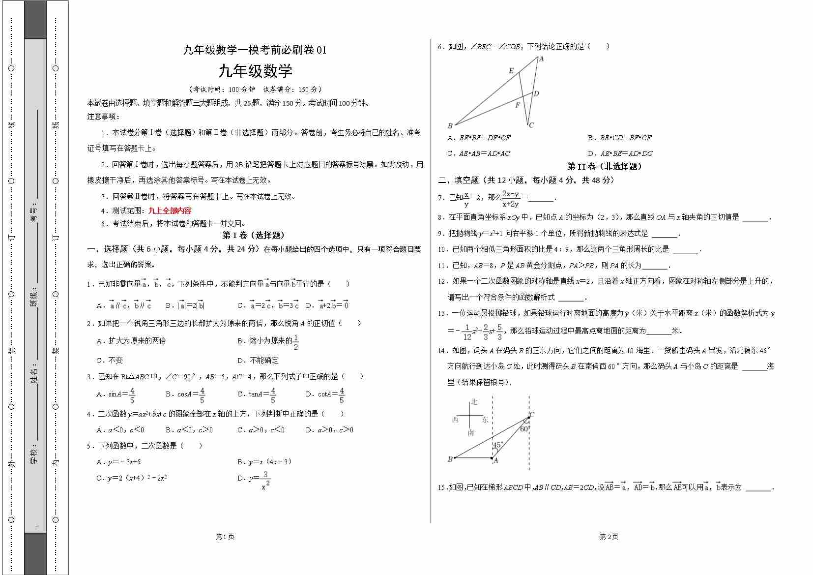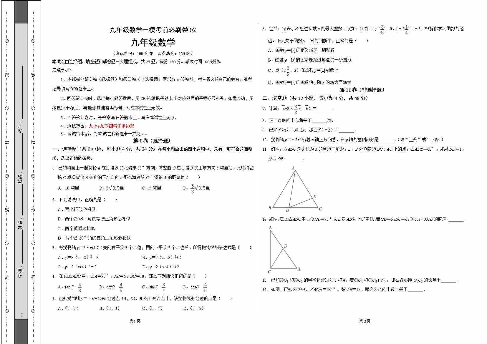提升卷:九年级数学一模考前必刷卷02(沪教版)(考试版)