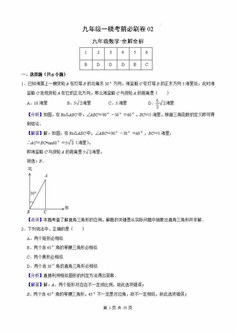 提升卷:九年级数学一模考前必刷卷02(沪教版)(全解全析)