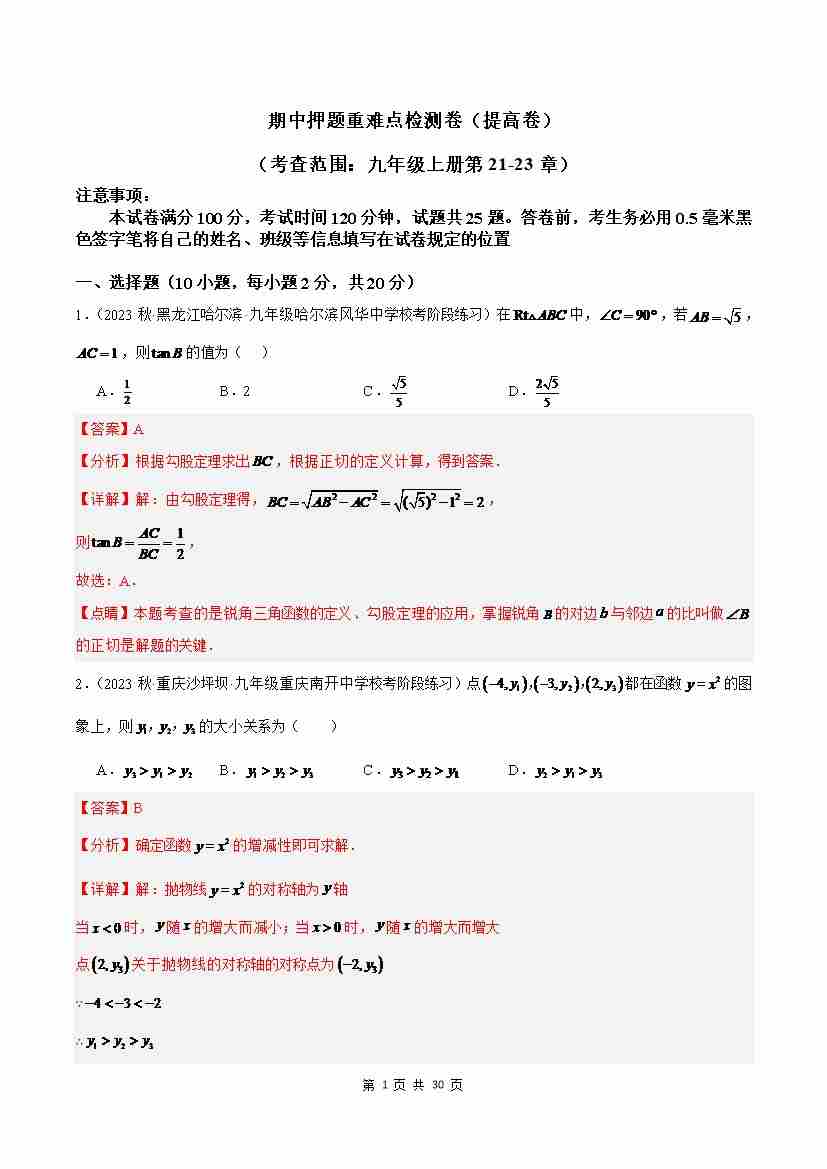 期中押题重难点检测卷(提高卷)(考试范围:第21-23章)(解析版)