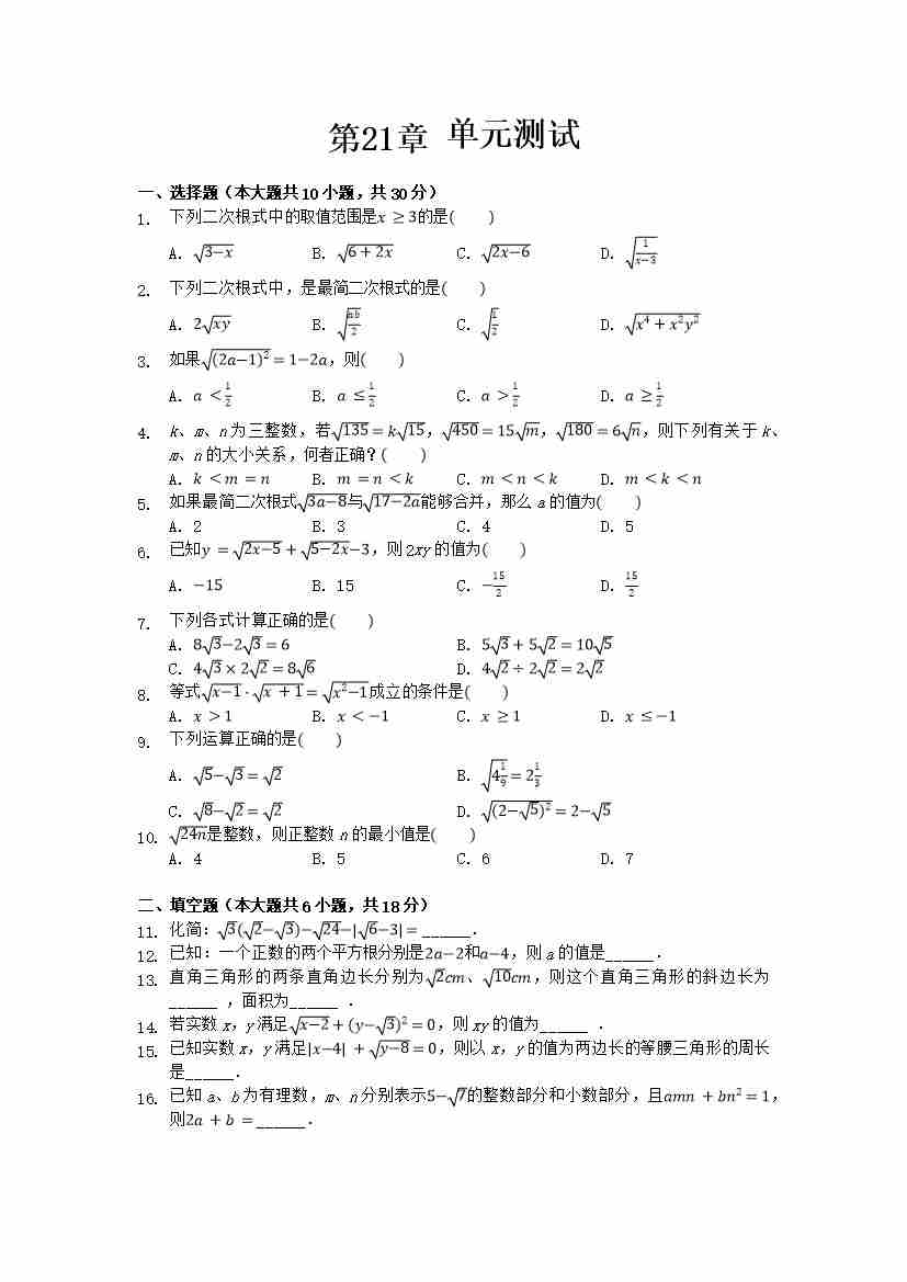 第21章 二次根式(单元重点综合测试)(原卷版)-2024-2025学年九年级数学上册单元速记·巧练(华东师大版)