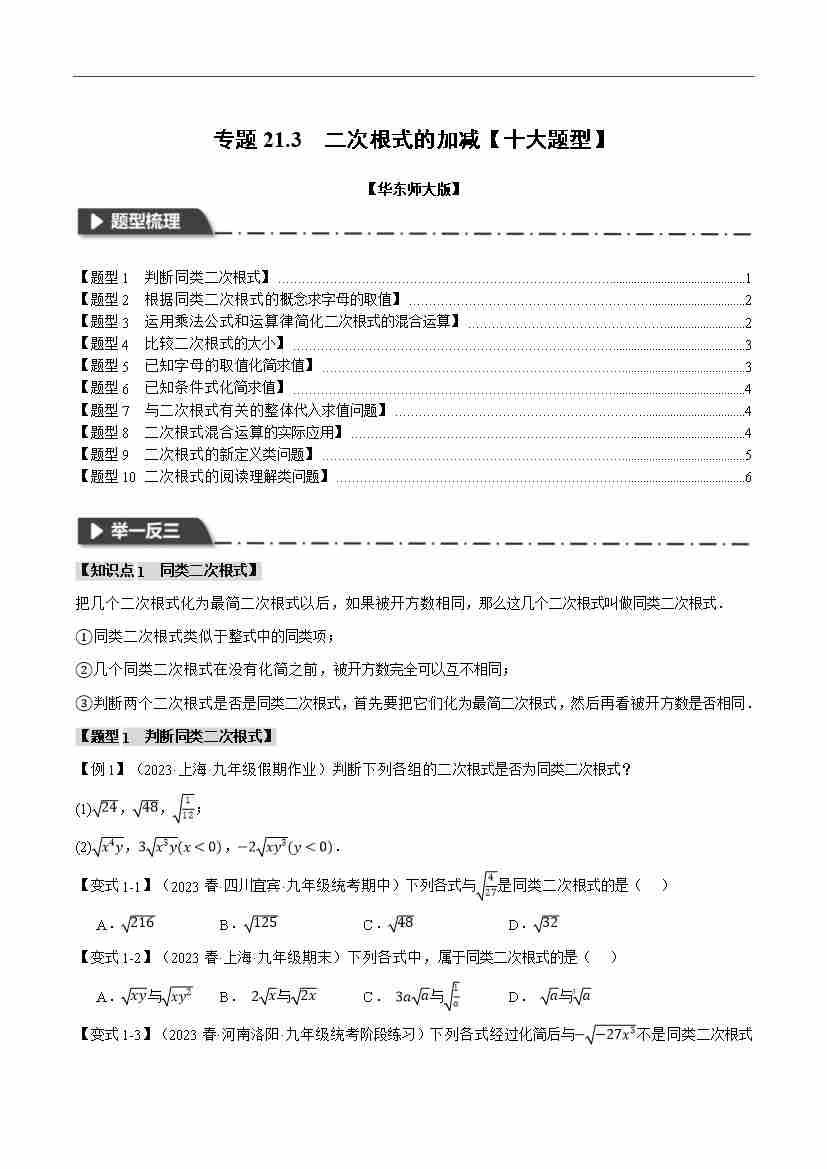 专题21.3 二次根式的加减【十大题型】(举一反三)(华东师大版)(解析版)