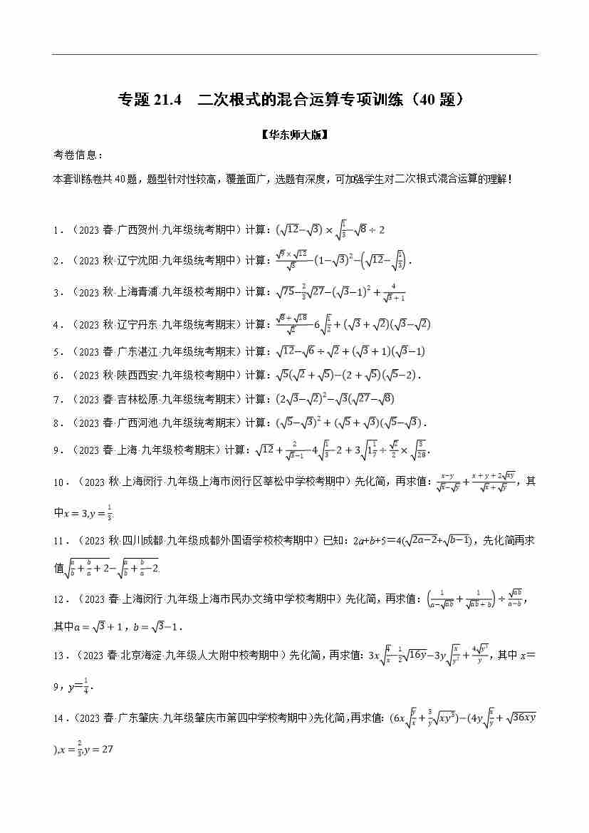 专题21.4 二次根式的混合运算专项训练(40题)(华东师大版)(原卷版)