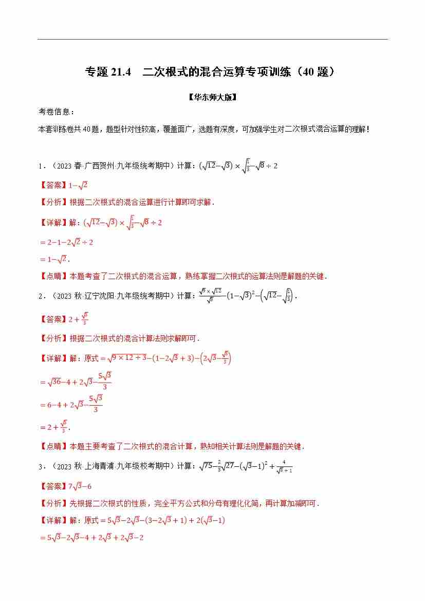 专题21.4 二次根式的混合运算专项训练(40题)(华东师大版)(解析版)