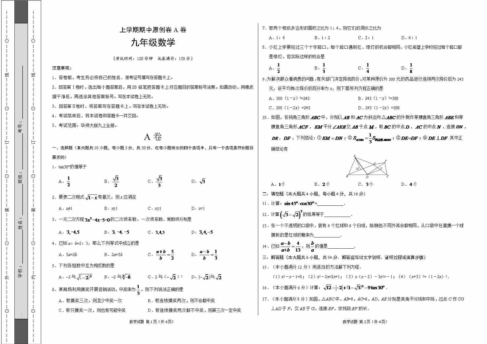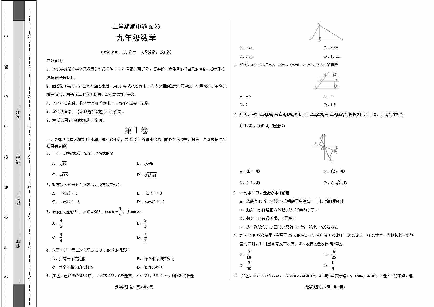 九年级数学上学期期中A卷(考试版)【测试范围:华师大版九上全册】