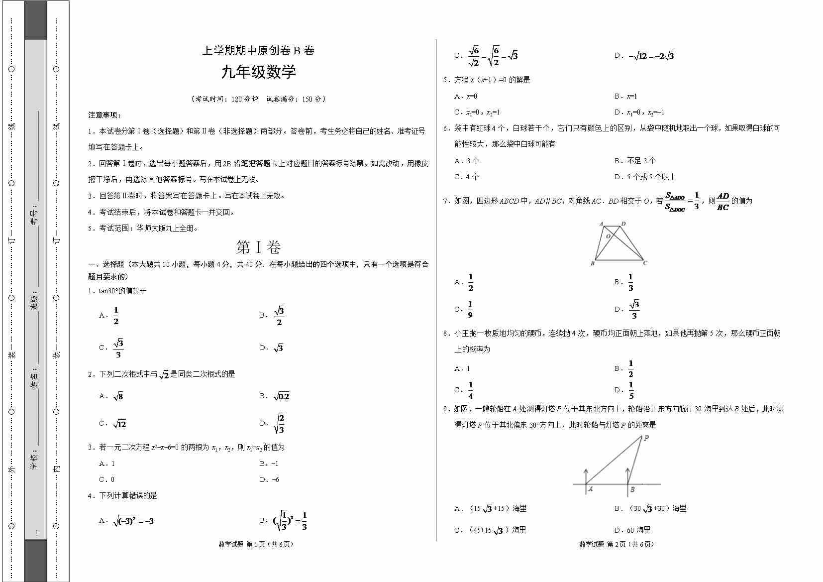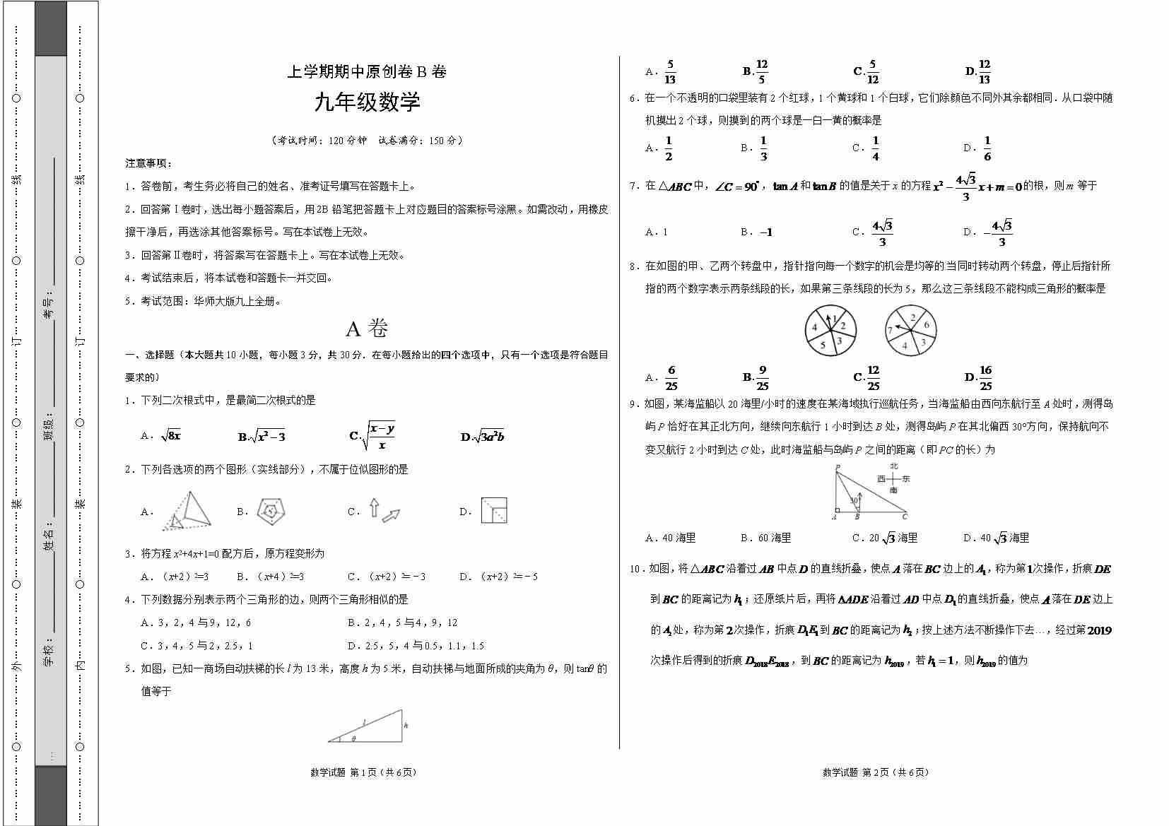 九年级数学上学期期中B卷(考试版)【测试范围:华师大版九上全册】
