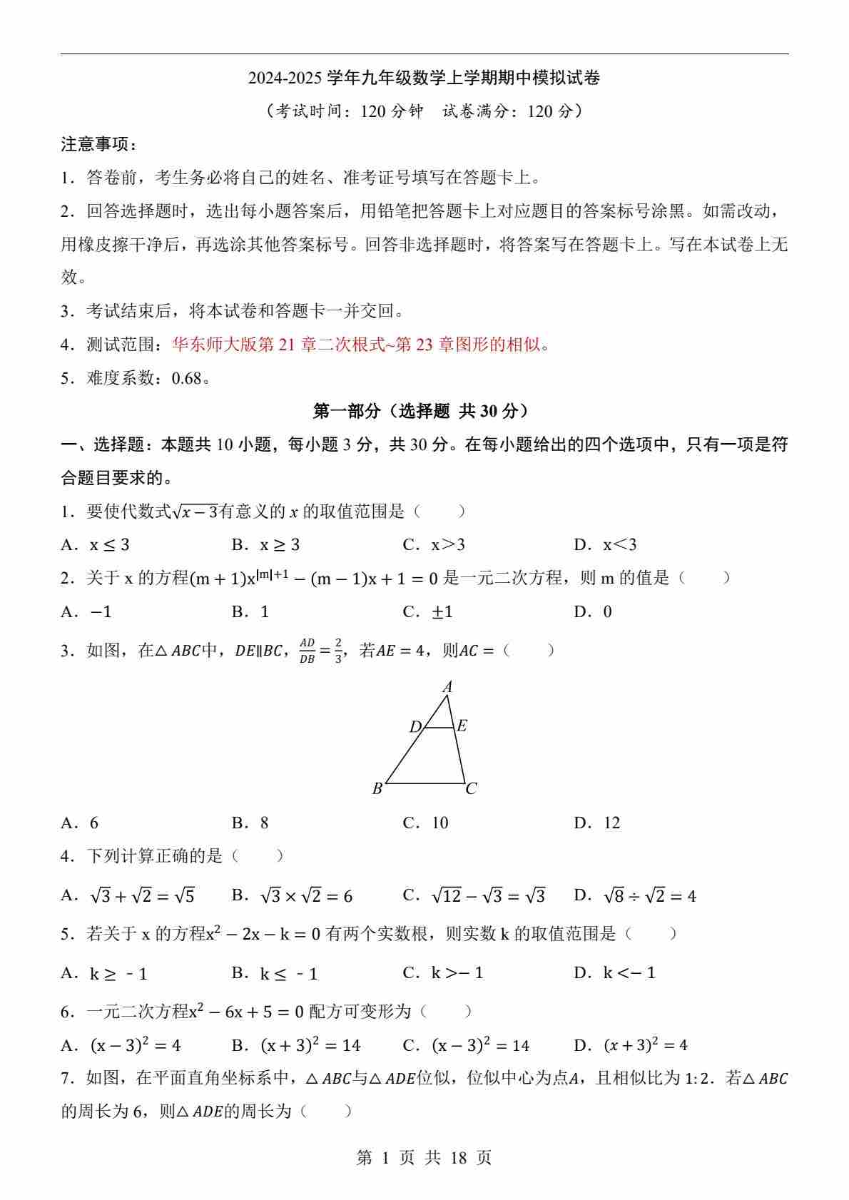 【华师】9上数学期中卷【第21-23章】
