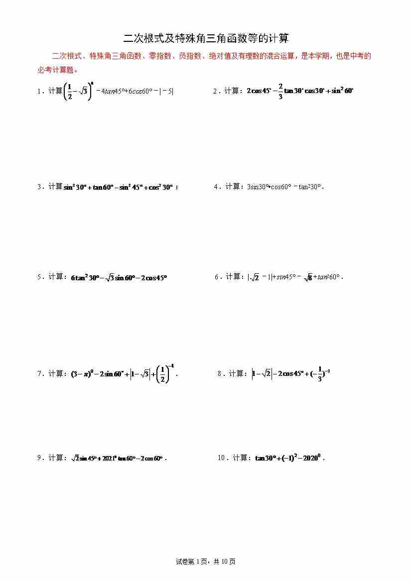 专题01 二次根式及特殊角三角函数等的计算九年级数学上学期期末解答题必刷专题训练(华师大版)(原卷版)