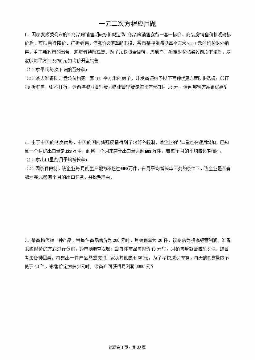 专题03 一元二次方程应用题九年级数学上学期期末解答题必刷专题训练(华师大版)(原卷版)