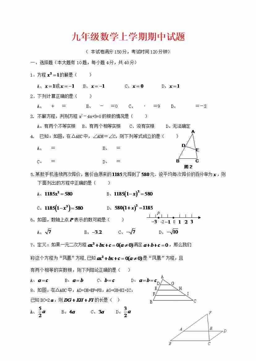 九年级数学上期中试题含答案--