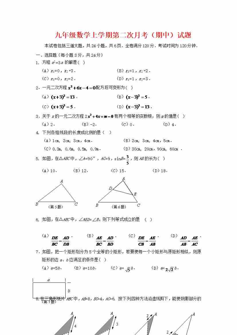 九年级上数学期中试卷及答案5