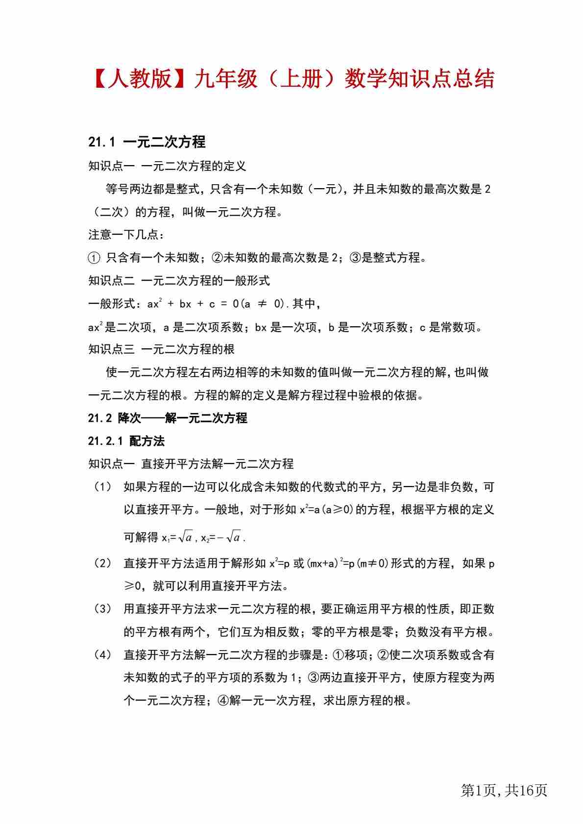 【人教】九上数学知识点总结
