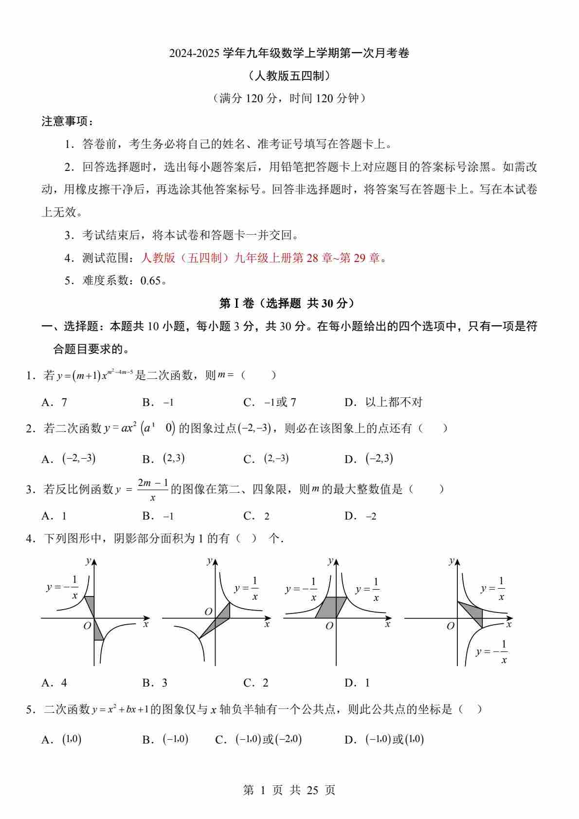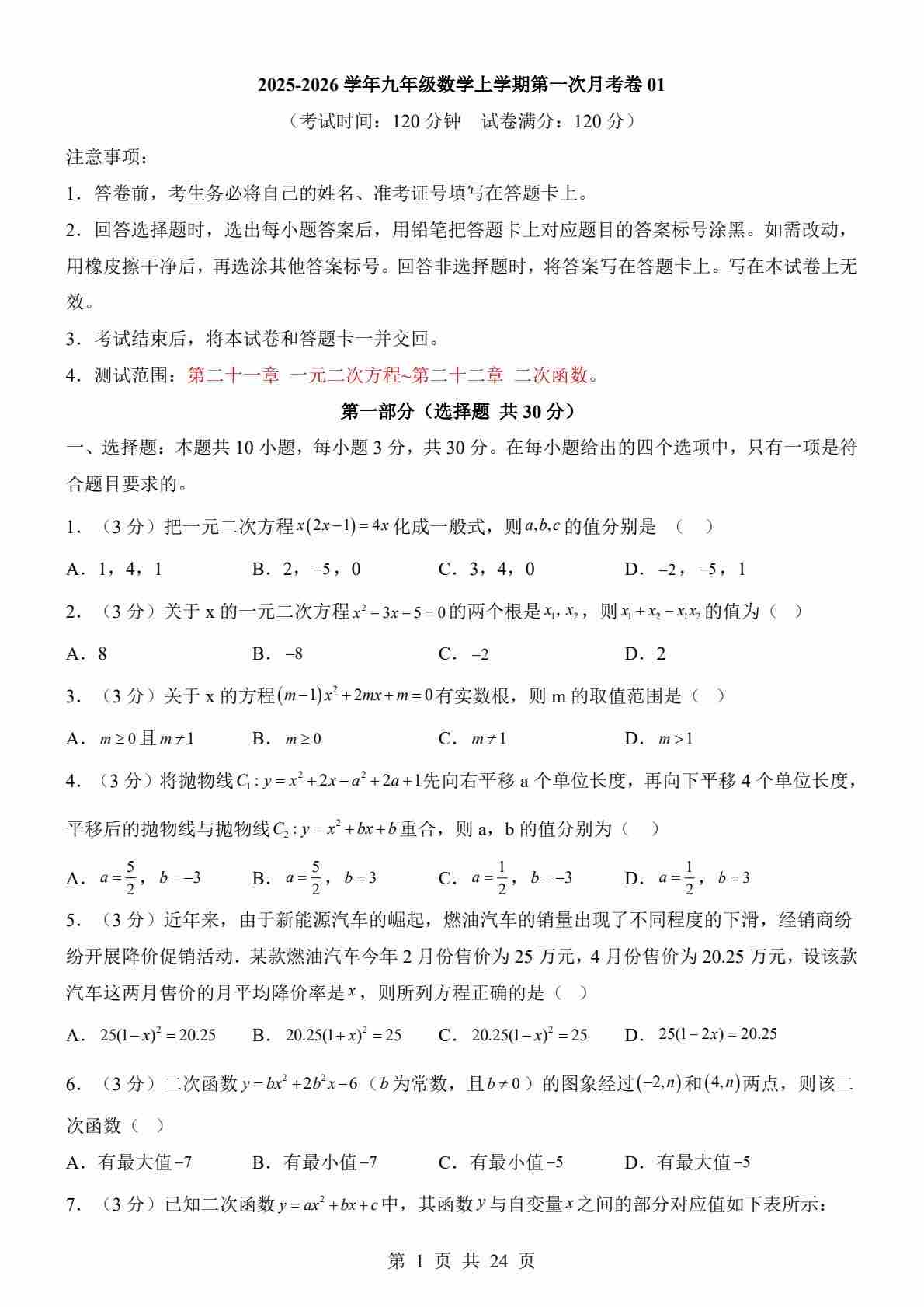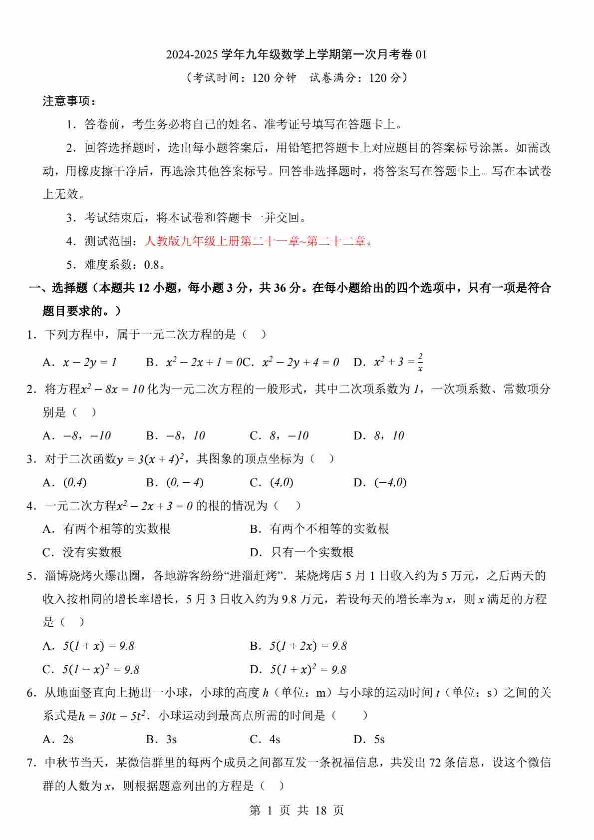 【人教】9上数学第1次月考01【第21-22章】(1)