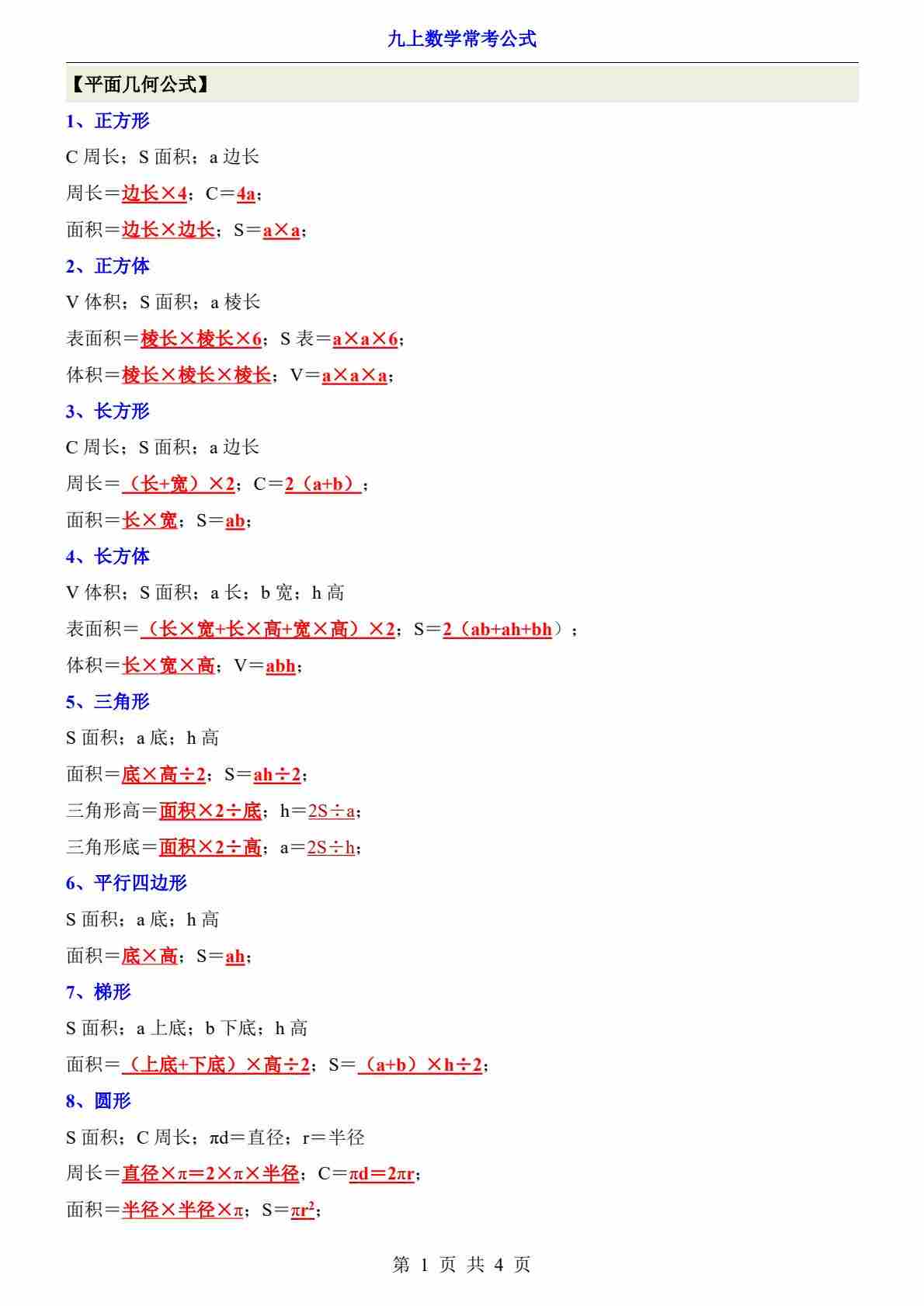 九上数学必背公式