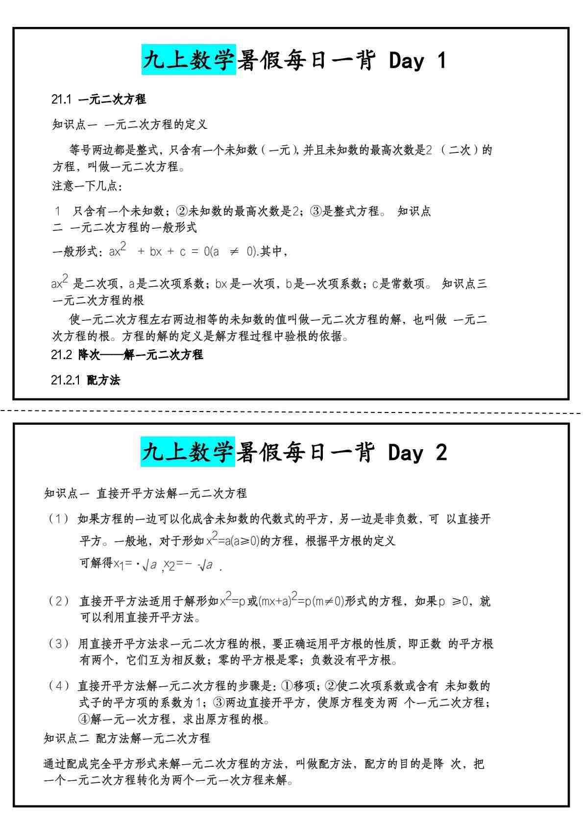 九上数学暑假每日一背