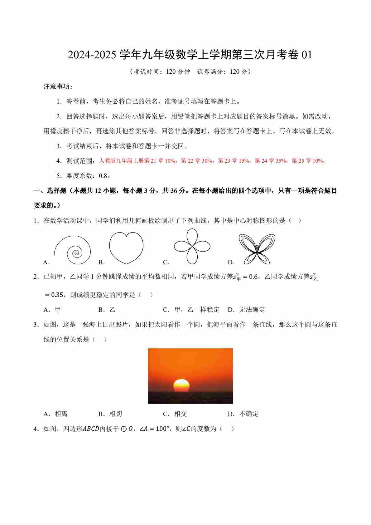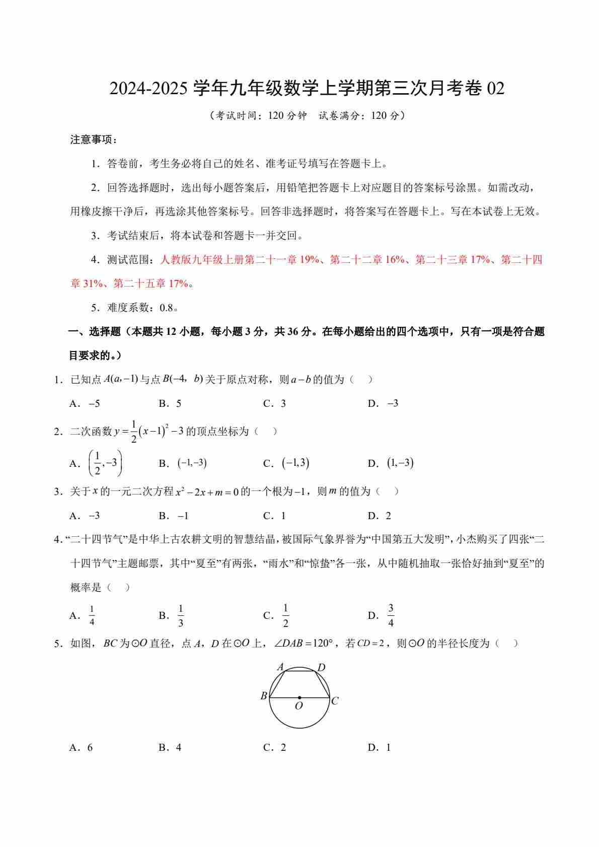 九年级数学第三次月考卷02(考试版A4)【测试范围:九年级上册第二十一章~第二十五章】(人教版)