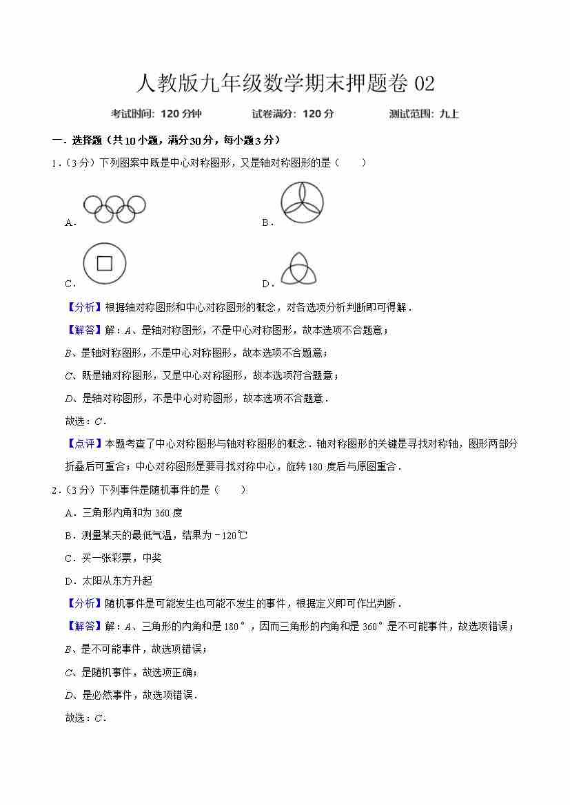人教版九年级数学期末押题卷02(测试范围:九上)(解析版)