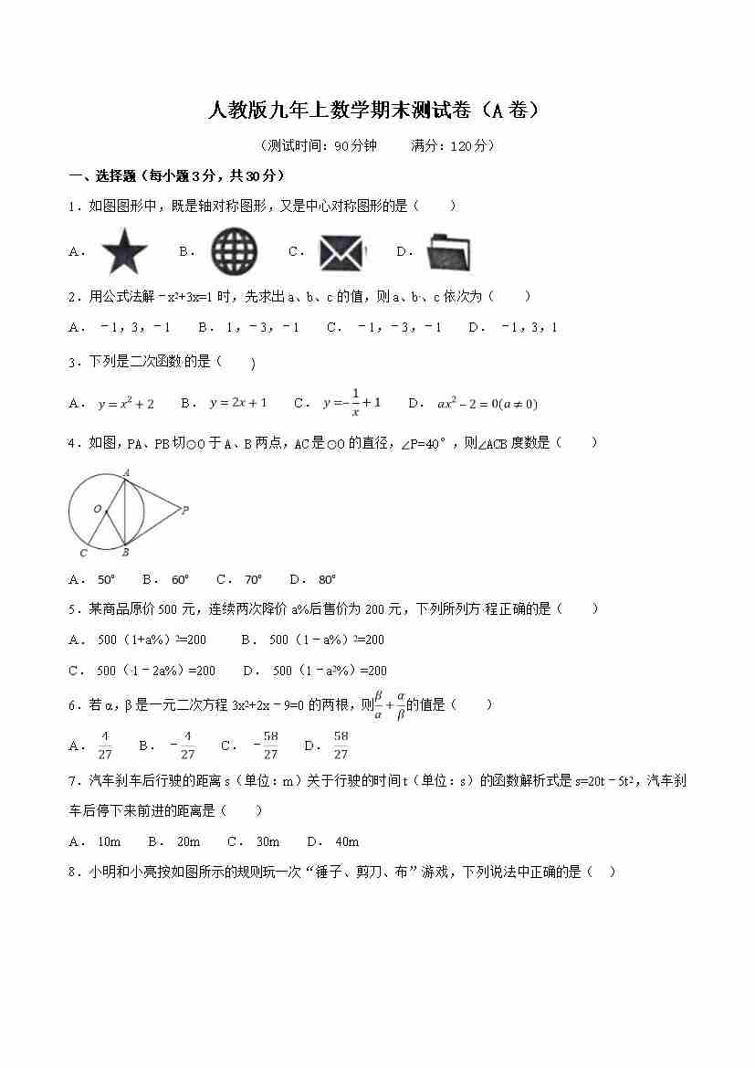 人教版九年级数学期末押题卷02(测试范围:九上)(原卷版)