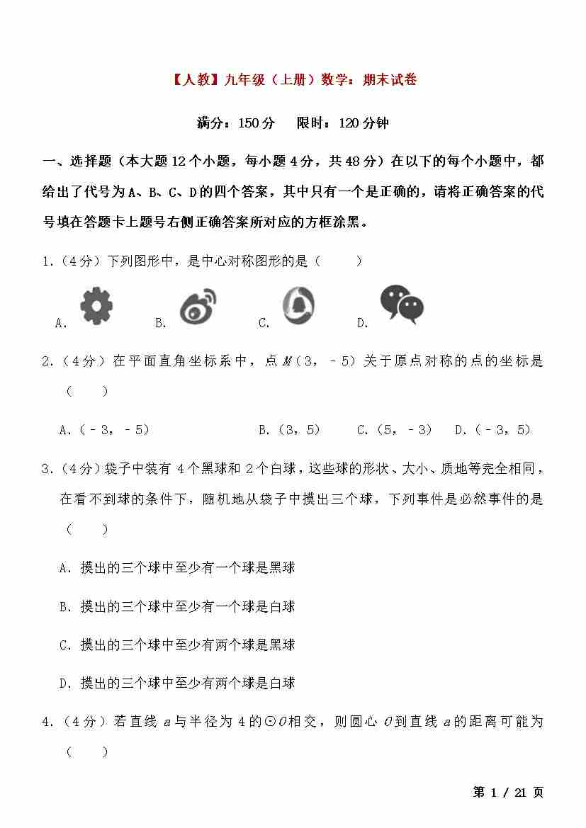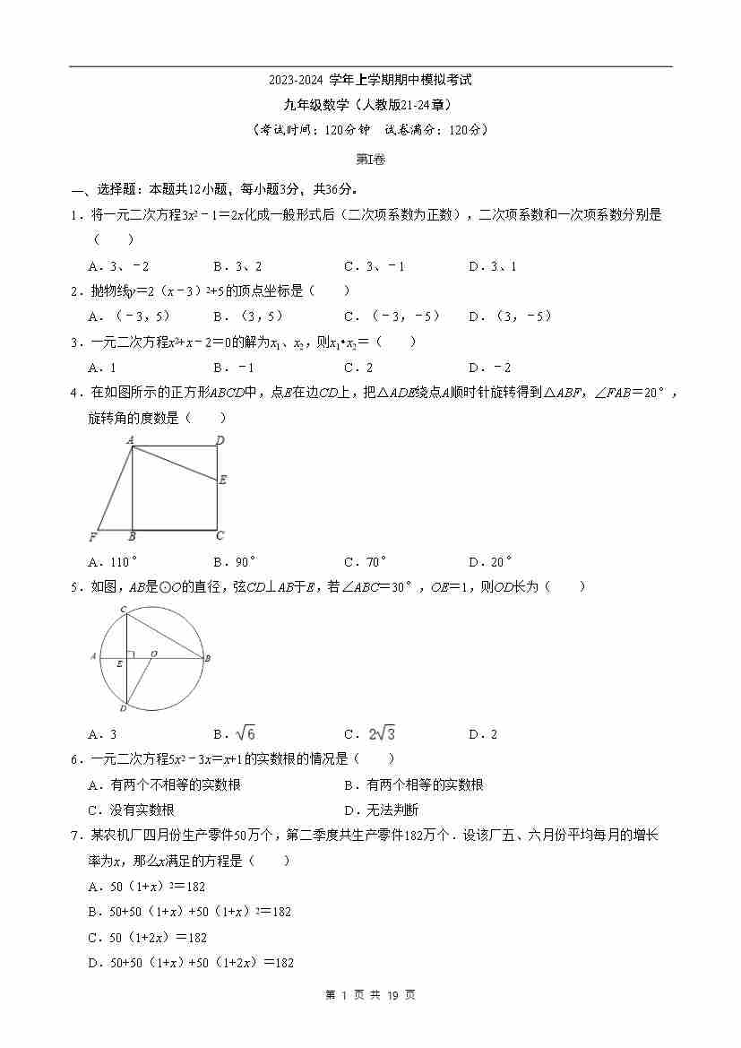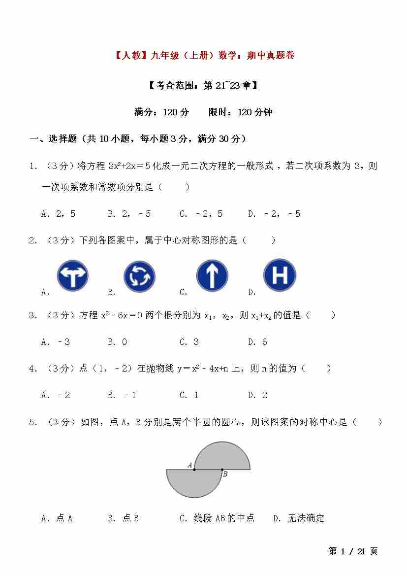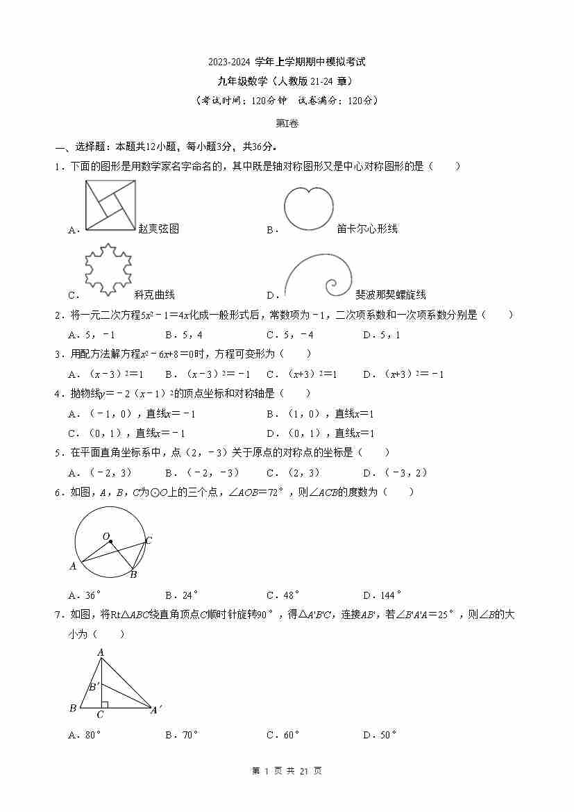 九上数学:【人教】期中模拟卷01【范围:21-24章】