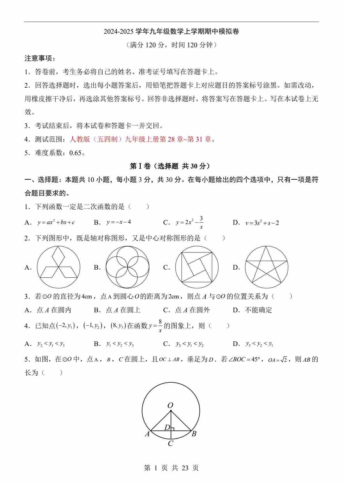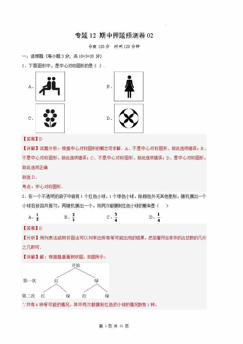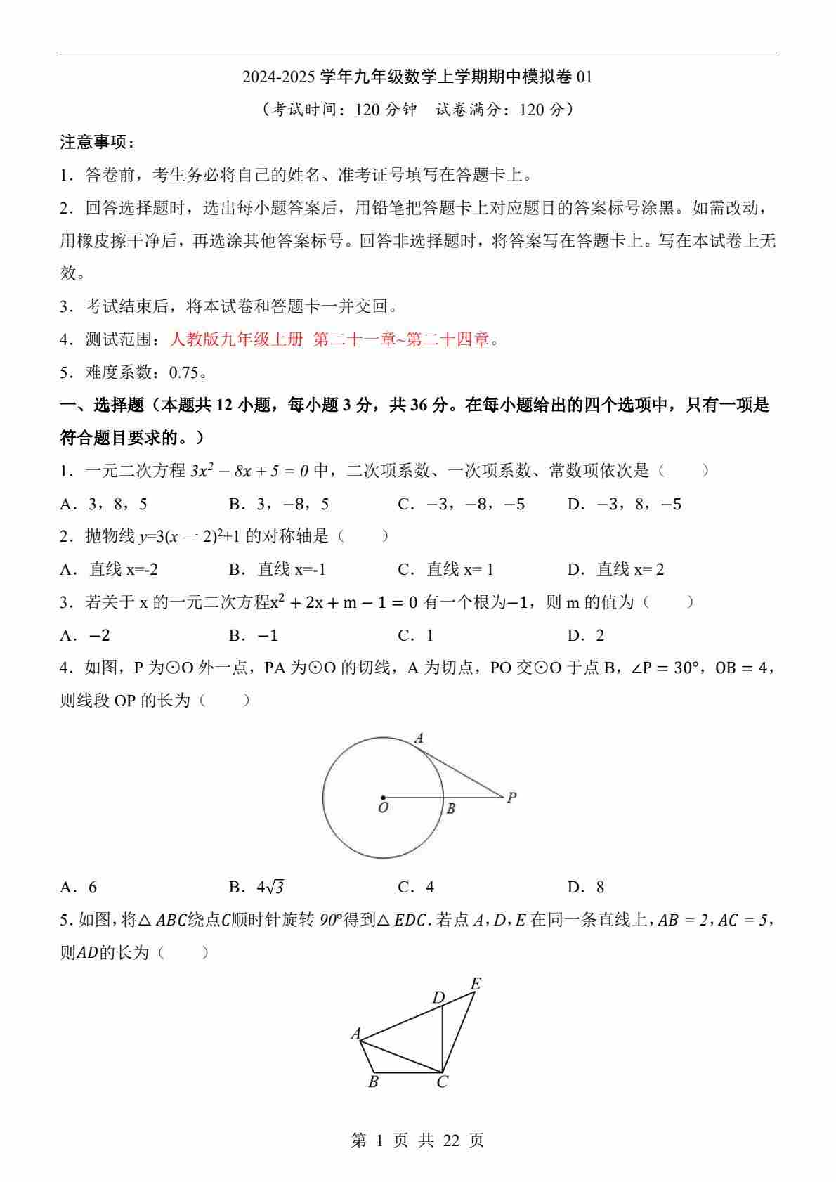 【人教】9上数学期中卷01【第21-24章】