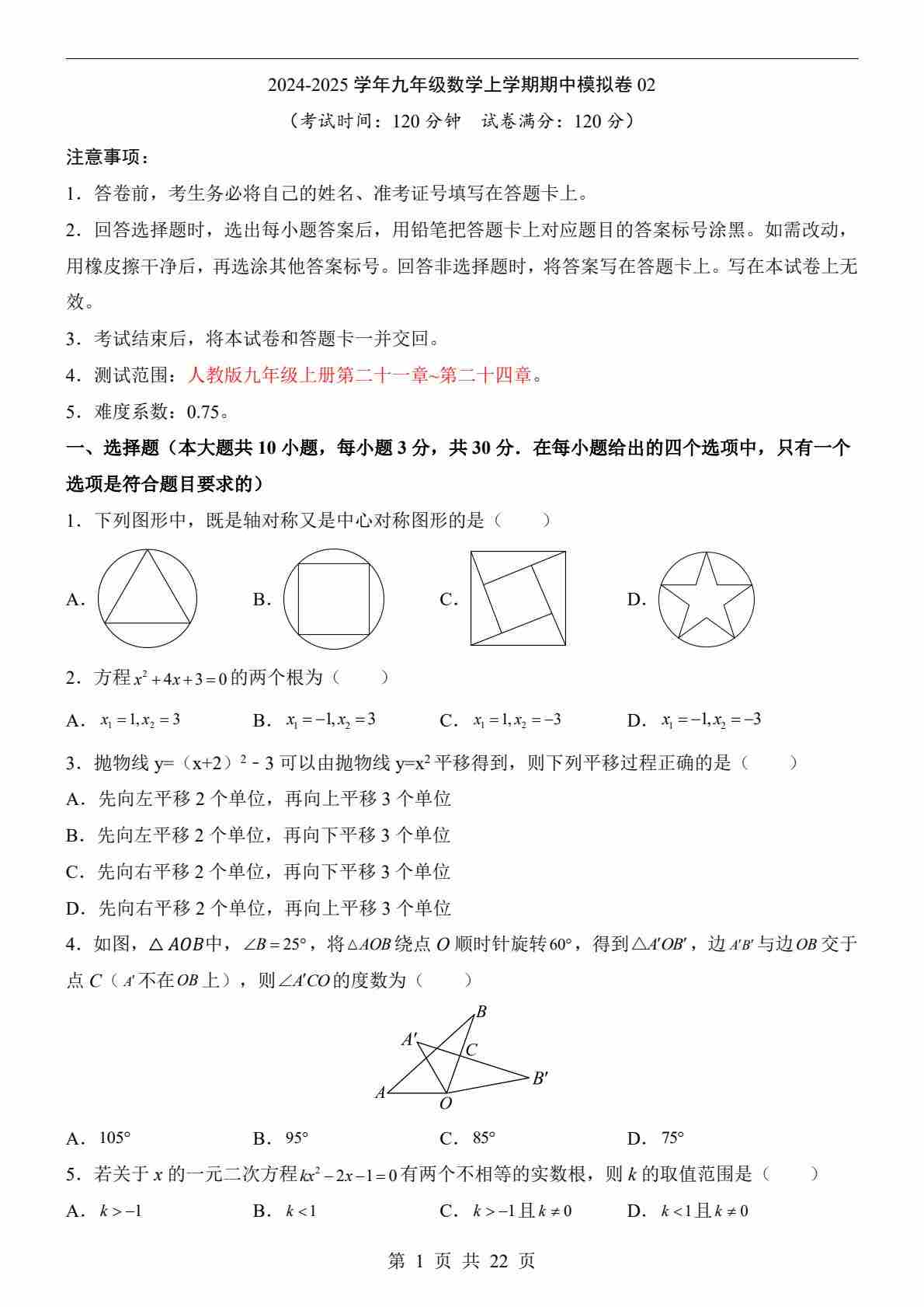 【人教】9上数学期中卷02【第21-24章】